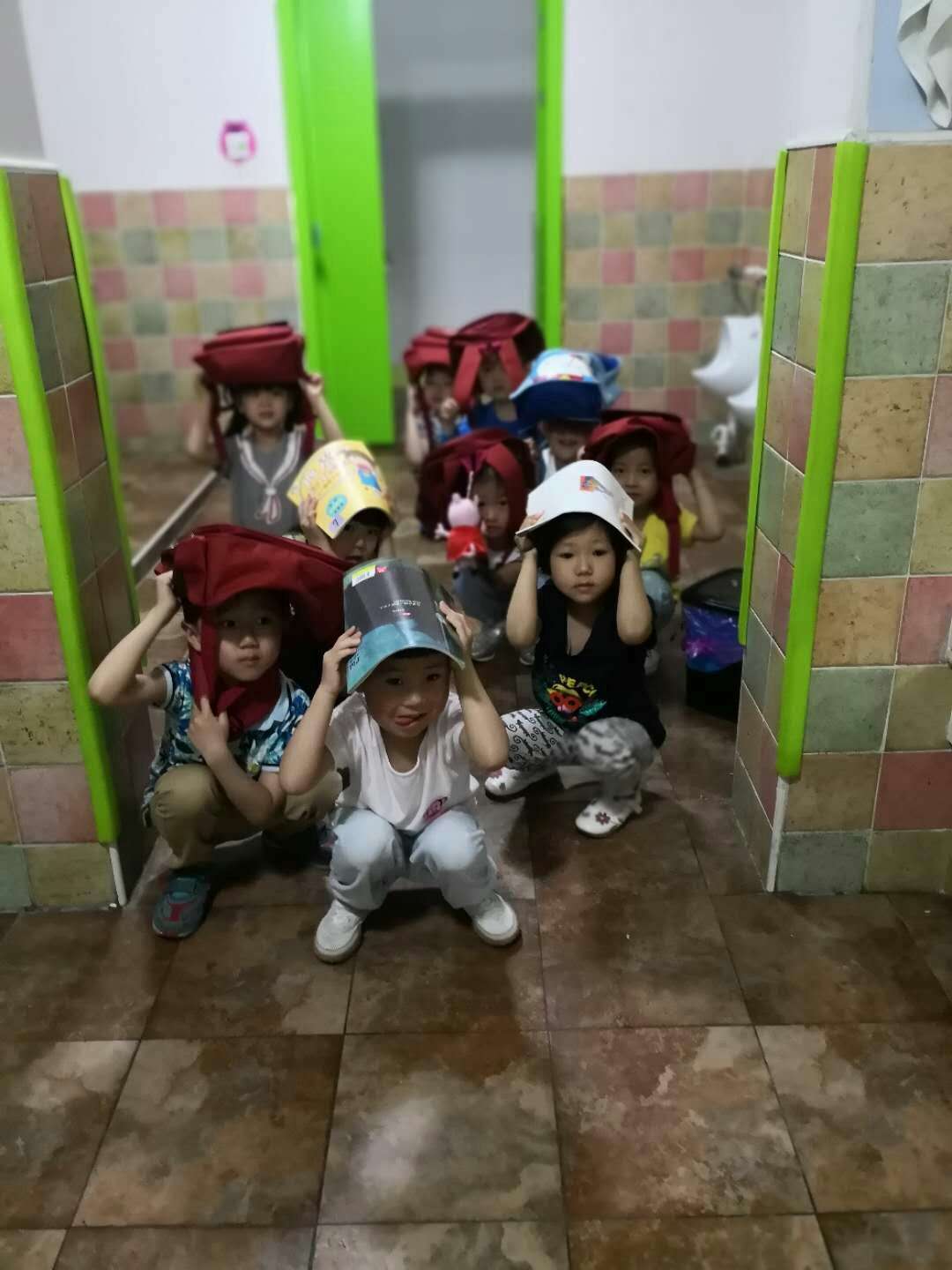 随着第一次警报声的响起,防震演练开始。各班教师快速到位,立即告诉幼儿“地震了,不要慌”,并指挥幼儿紧急避险,指导幼儿双手护头,或者用书包护头,到角落躲避。