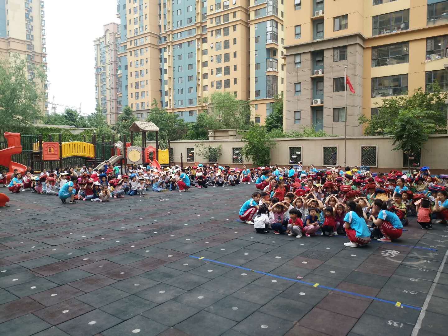 第二次警报响起,各班老师组织孩子有序撤离到户外安全地带。在撤离的过程中,孩子们听指挥、有秩序、不慌张,快速安全到达空旷场地。