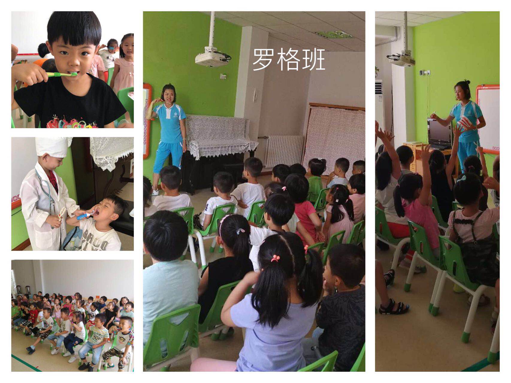 孩子们把自己打扮成医生的模样,给同伴检查牙齿,以情景再现的模式,让自己和身边的人意识到牙齿健康的重要性。