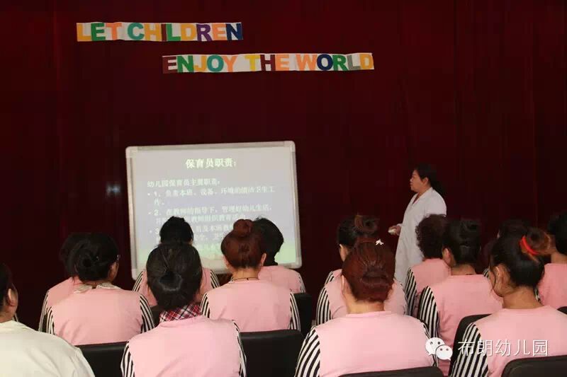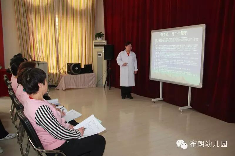 3月26日布朗西马园保健医和后勤副园长对全园保育员及实习生进行了培训学习活动。培训学习内容主要从两个方面进行:一是从心态;每天保持一个积极向上、热情乐观、认真负责良好的心态上岗,要求所有保育员不能忽视自己的工作,对班级工作积极配合,对孩子要有百分二百的爱心、耐心、细心;同时要求老保育教师对新实习生要认真负责的传授保育经验,实习生更要虚心向有经验的老师学习。二是从实际工作出发;要求班级教师合理安排好自己的时间,要分工明确。