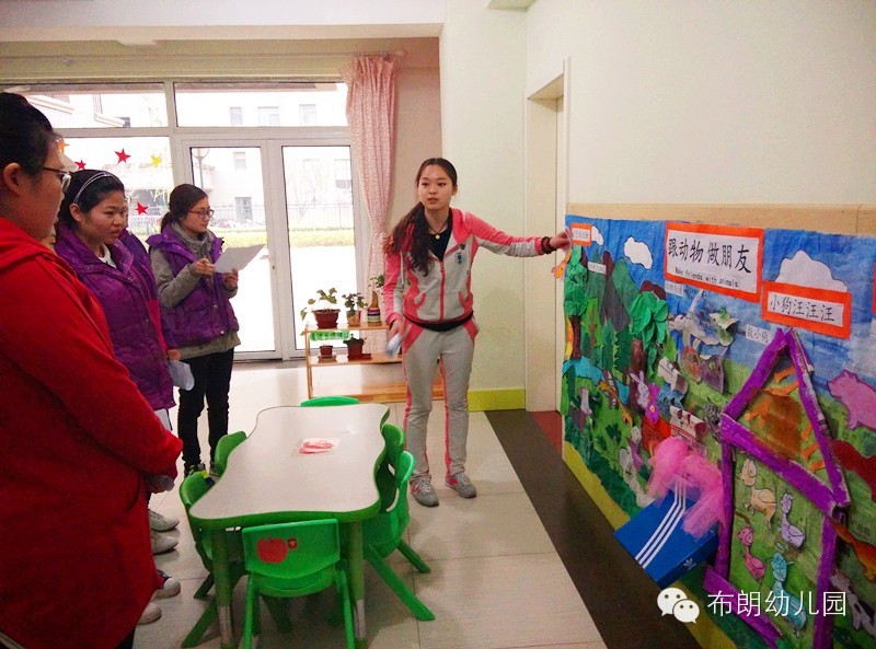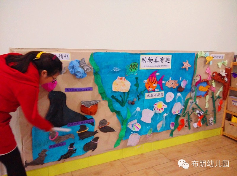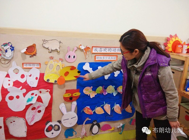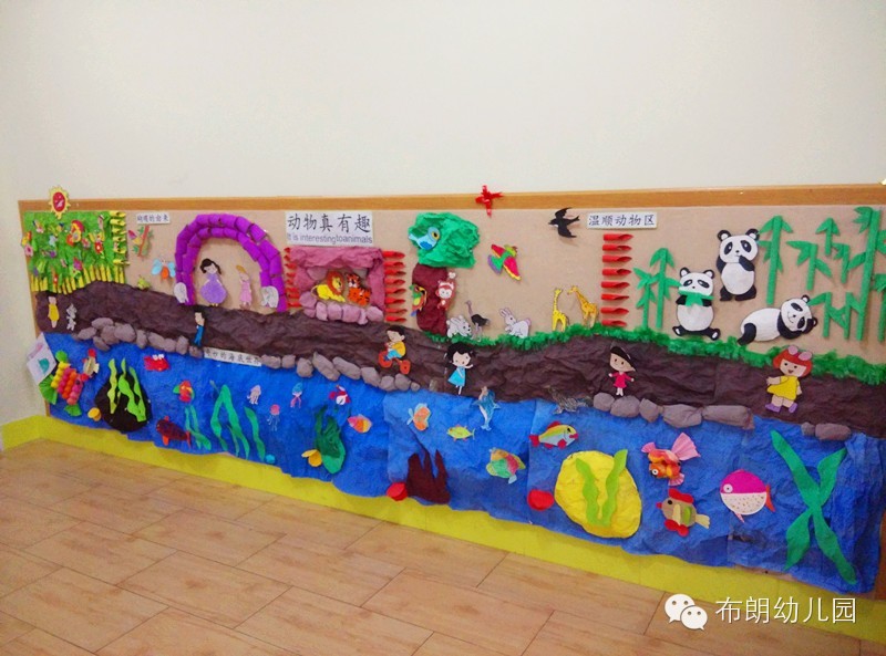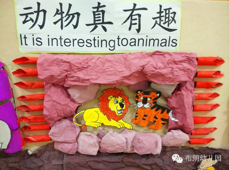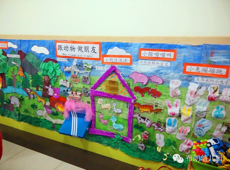 幼儿园的主题墙饰一直成为幼儿在园生活的重要部分。通过主题墙的创设生动、直观、真实的再现了师幼之间近距离的对话;幼儿与教师之间亲密的关系;幼儿与幼儿之间的情感氛围。3月31日,布朗幼儿园又迎来了每个月一次的环境创设评比活动。各班级结合本月教学主题《动物真有趣》、《我和动物做朋友》、《动物世界》等进行了主题墙环境创设。老师们认真挖掘主题内涵,从幼儿的年龄特点出发,从主题墙创设应遵循的原则入手,用多种形式积极展现,本着丰富性、艺术性、互动性为出发点,让幼儿以主人的身份直接参与主题环境创设。其次,将收集的材料和创设环境的过程作为幼儿的学习过程,教师由原来的动手者转变为观察者,倾听者和支持者。真正使主题墙创设成为幼儿园教育教学活动中的有效资源。