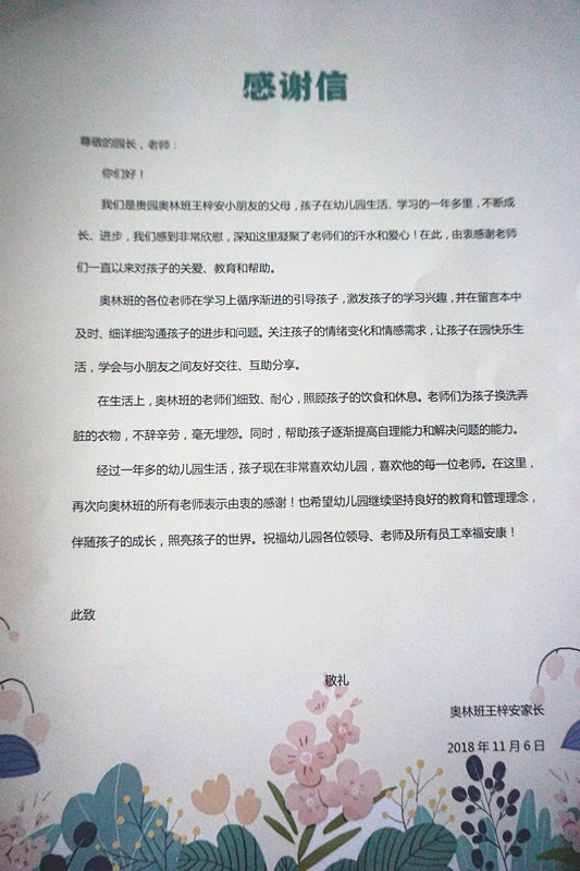 信中写到“奥林班的各位老师在学习上循序渐进的引导孩子,激发孩子的学习兴趣,并在家园联系册中及时、详细的沟通孩子的进步和问题,关注孩子的情绪变化和情感需求,让孩子在园快乐生活,学会与小朋友之间友好交往、互相分享。在生活上,奥林班的老师们细致、耐心,照顾孩子的饮食和休息。老师们为孩子换洗弄脏的衣物,不辞辛劳、毫无埋怨。同时,帮助了孩子逐渐提高自理能力和解决问题的能力。”家长的话语就是对老师们最公正的评价,也是对幼儿园管理最好的肯定。