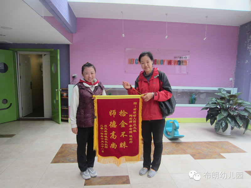 拾金不昧是我们中华民族的传统美德,是一个人高尚道德情操的体现。金泰园陶丹丹老师的拾金不昧行为,充分体现了金泰园老师高尚的道德情操和精神风貌,她用自己拾金不昧的实际行动展现了我们布朗人的优秀品质。布朗幼儿园金泰园全体教职工向陶丹丹老师学习,用我们的高素质、高品德、高修养为布朗幼儿园创造更加美好的明天。教师播撒着阳光雨露到幼儿心中,我们每一位教师的师德都如同榜样和阳光,俗话说,亲其师,则信其道;信其道,则循其步。教师是旗帜,幼儿如影随形般地追着走;教师是路标,幼儿毫不迟疑地顺着标记前行。这就强调了师德师风建设的重要性。教师首先自己要有高尚的道德情操,才能以德治教、以德育人,以高尚的情操引导幼儿全面发展。