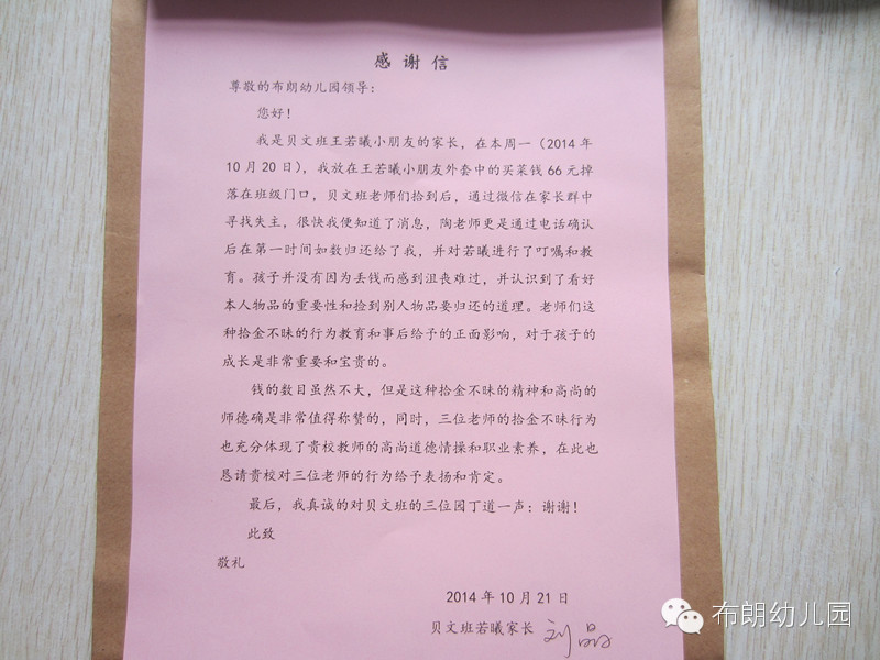 拾金不昧是我们中华民族的传统美德,是一个人高尚道德情操的体现。金泰园陶丹丹老师的拾金不昧行为,充分体现了金泰园老师高尚的道德情操和精神风貌,她用自己拾金不昧的实际行动展现了我们布朗人的优秀品质。布朗幼儿园金泰园全体教职工向陶丹丹老师学习,用我们的高素质、高品德、高修养为布朗幼儿园创造更加美好的明天。