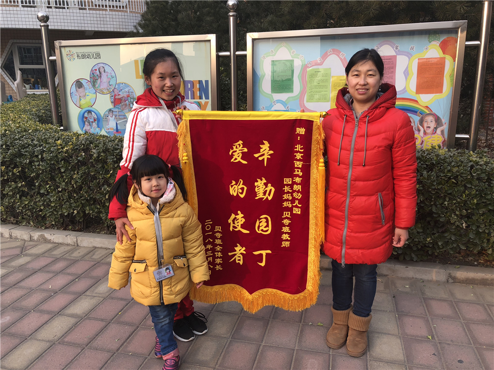 3月8日是一年一度的国际妇女节,在这个特别的节日里,布朗幼儿园北京西马园贝文班和贝奇班,分别收到了家长代表送来的沉甸甸的礼物——锦旗。