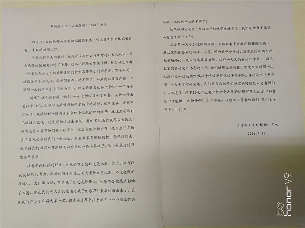 家长体验日活动的开展缩短了幼儿园与家长之间的距离,让家长更加全面地了解了幼儿园的教学方式、生活动态,提高了幼儿园管理透明度,为将来更好的沟通和交流搭建了平台。此次活动,也赢得了家委对园所工作的支持、体谅和赞扬,布朗的老师们很欣慰,但同时更会对自己的工作提高要求,不负期望!布朗幼儿园将不断努力提高幼儿园的办园质量和口碑,为共同实现“让儿童拥有世界”的愿景不断努力!