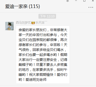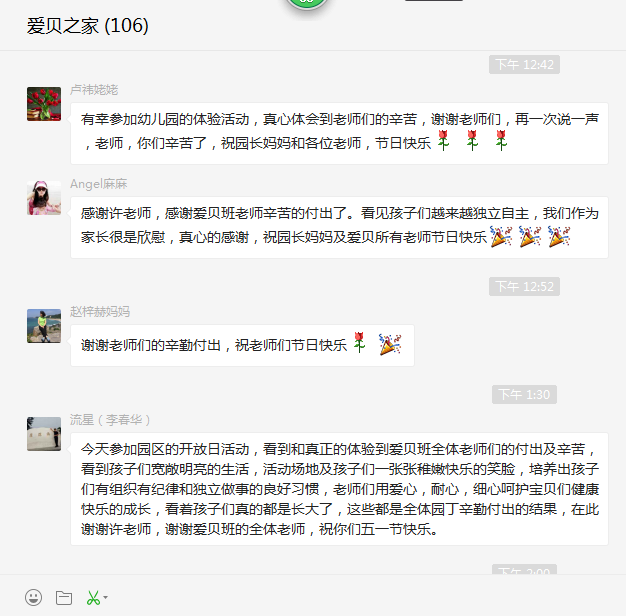 活动刚结束,就有不少的家长在班级的微信群发布信息,感恩老师的辛苦付出,感谢幼儿园呢!家长们的一句感谢,一句肯定,让我们倍感欣慰,是我们的动力,作为老师的我们虽然累着,却也快乐着、幸福着!我们依然会一如既往,再接再厉,砥砺前行,陪伴着孩子们一同成长,为更好的明天不懈奋斗!
