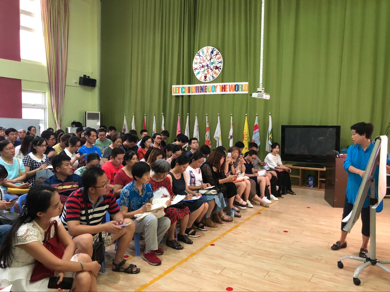 首先,园长妈妈向家长们介绍了布朗幼儿园的教育理念、办园特色、师资队伍等幼儿园基本情况,重点介绍了幼儿园的四大课程,使家长进一步了解我园的教学特色。为了解决家长们的后顾之忧,园长妈妈还详细地讲述了幼儿园一日作息安排,对家长们特别关心的进餐、午睡等环节进行了细致说明。