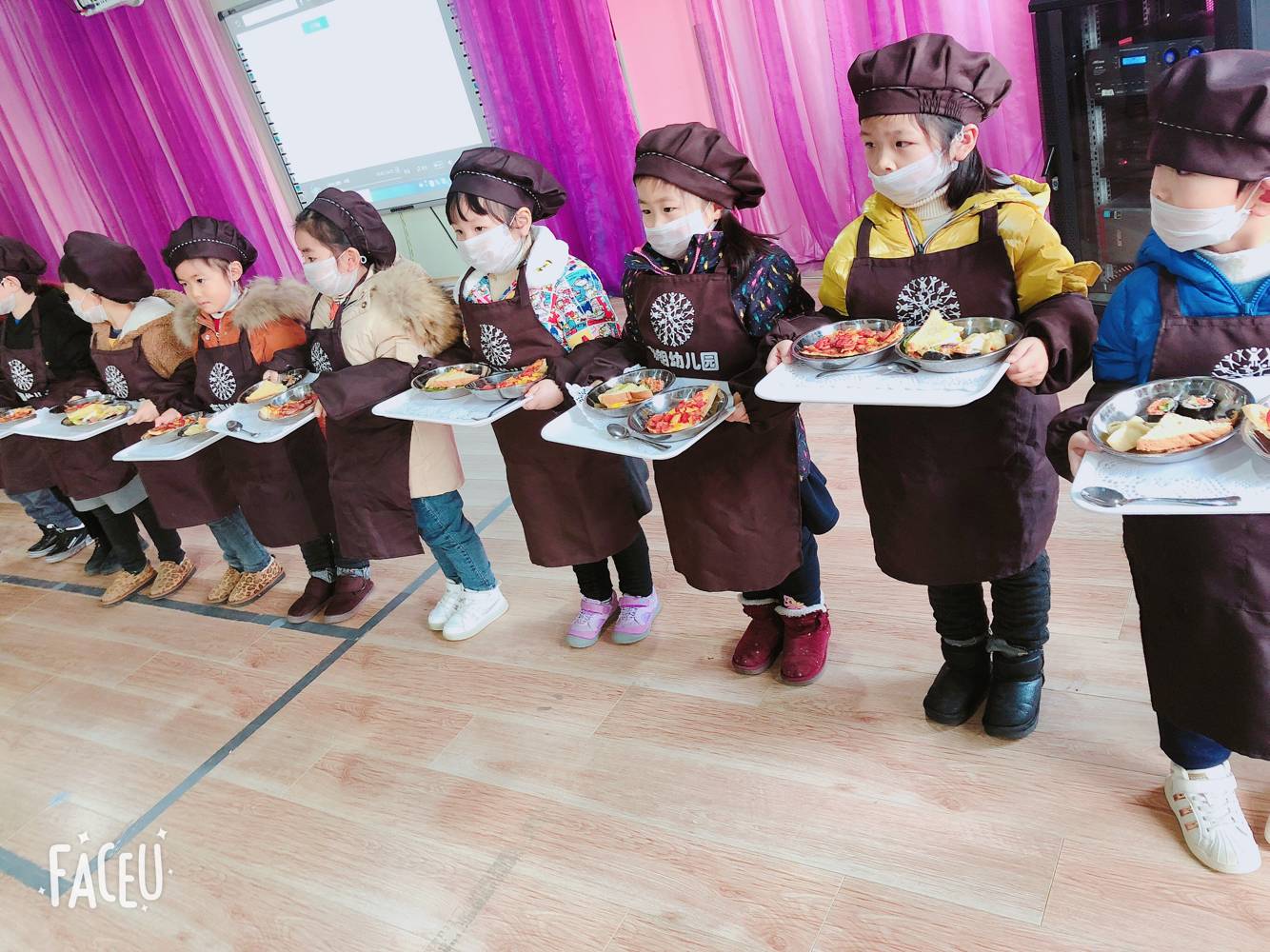大家跟着音乐的节奏手牵手进入会场。我们各个年龄段的孩子分别制作了本学期班级小厨房的特色食物,你瞧!有美味三明治,可口的四喜饺,色彩缤纷的沙拉,好吃的寿司,还有茶水呢!爸爸妈妈快来品尝我们的成果吧!