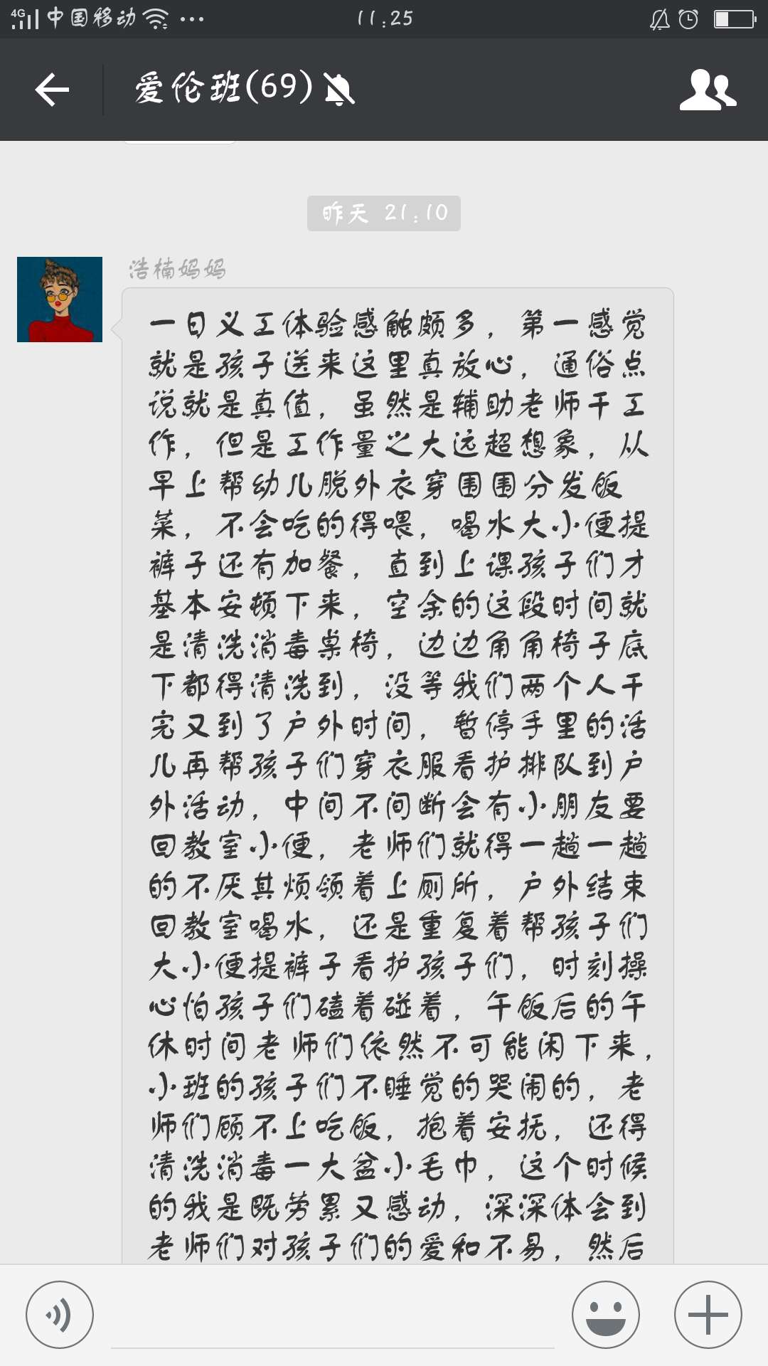 一日义工体验感触颇多,第一感觉就是孩子送来这里真放心,通俗点说就是真值,虽然是辅助老师干工作,但是工作量之大远超想象,从早上帮幼儿脱外衣穿围围分发饭菜,不会吃的得喂,喝水大小便提裤子还有加餐,直到上课孩子们才基本安顿下来,空余的这段时间就是清洗消毒桌椅,边边角角椅子底下都得清洗到,没等我们两个人干完又到了户外时间,暂停手里的活儿再帮孩子们穿衣服看护排队到户外活动,中间不间断会有小朋友要回教室小便,老师们就得一趟一趟的不厌其烦领着上厕所,户外结束回教室喝水,还是重复着帮孩子们大小便提裤子看护孩子们,时刻操心怕孩子们磕着碰着,午饭后的午休时间老师们依然不可能闲下来,小班的孩子们不睡觉的哭闹的,老师们顾不上吃饭,抱着安抚,还得清洗消毒一大盆小毛巾,这个时候的我是既劳累又感动,深深体会到老师们对孩子们的爱和不易,然后又得准备下午加餐水果,孩子们睡起来穿衣服叠被子摞床给女生梳头发、户外、喝水、上课……晚餐后检查幼儿衣服穿好没有洗脸抹油……终于等到接园了,回家先来个葛优躺,真不容易啊!真心希望所有的家长都能体验一次,消毒工作真的是360度无死角,这环境无可挑剔没得说!老师们大爱、付出令我感动,孩子交给你们放心。