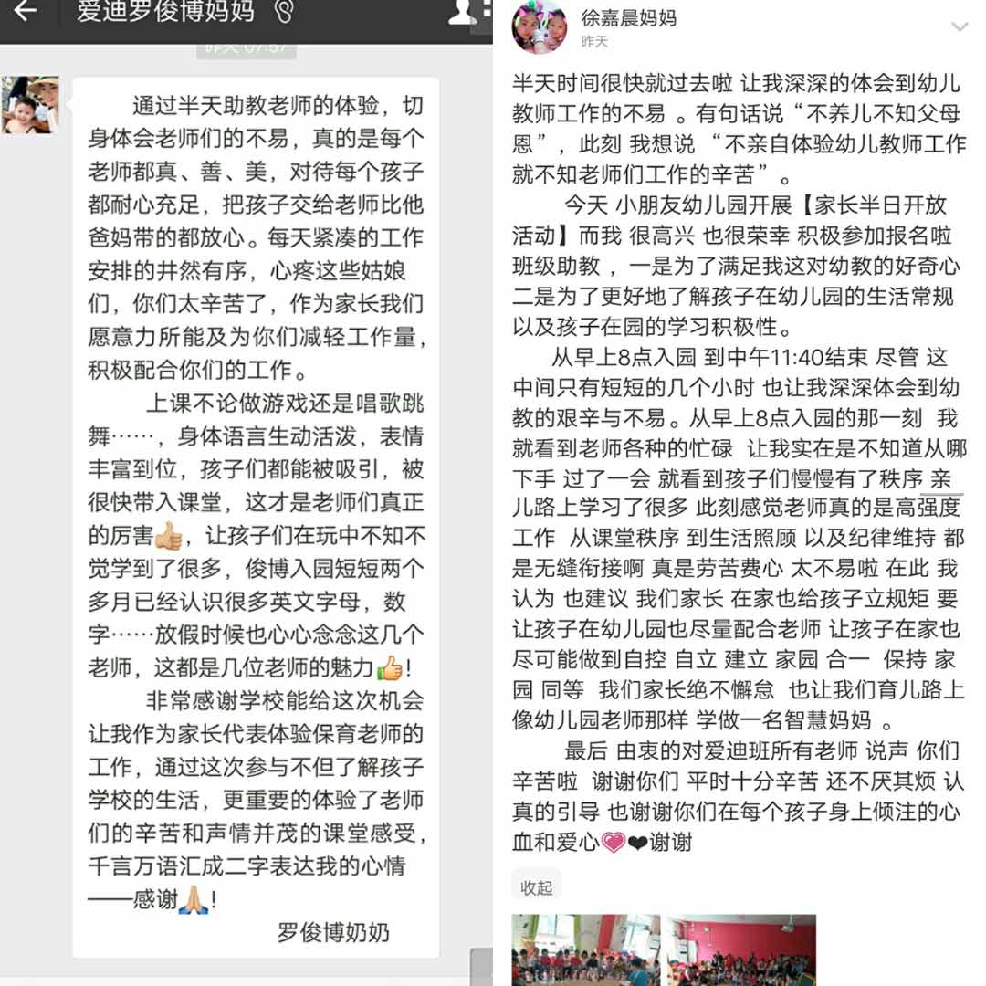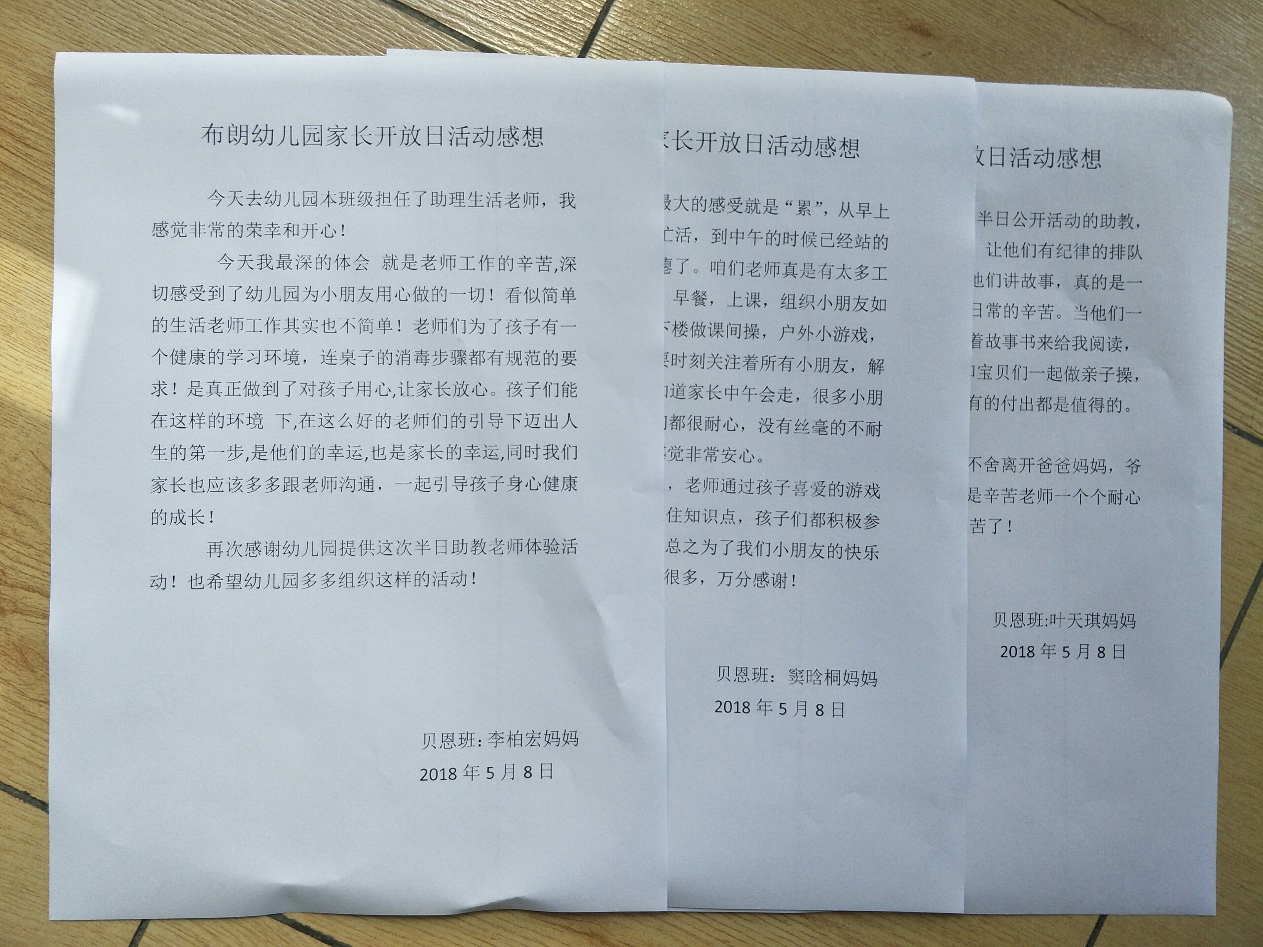 本次家长半日开放活动,家长助教团也是一道亮丽的风景线,他们认真负责、一丝不苟得完成助教工作,同时对本次的体验活动也感悟颇深,主动与班长分享感受,并对老师的工作给出高度的赞扬和肯定。感谢有您,我们的活动才能精彩纷呈;感谢有您,我们的孩子如此幸福快乐;感谢有您,布朗幼儿园更有前进的信心和动力!