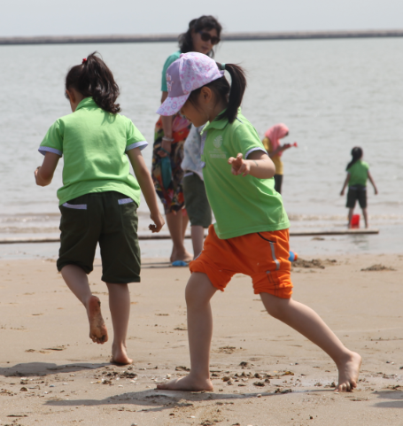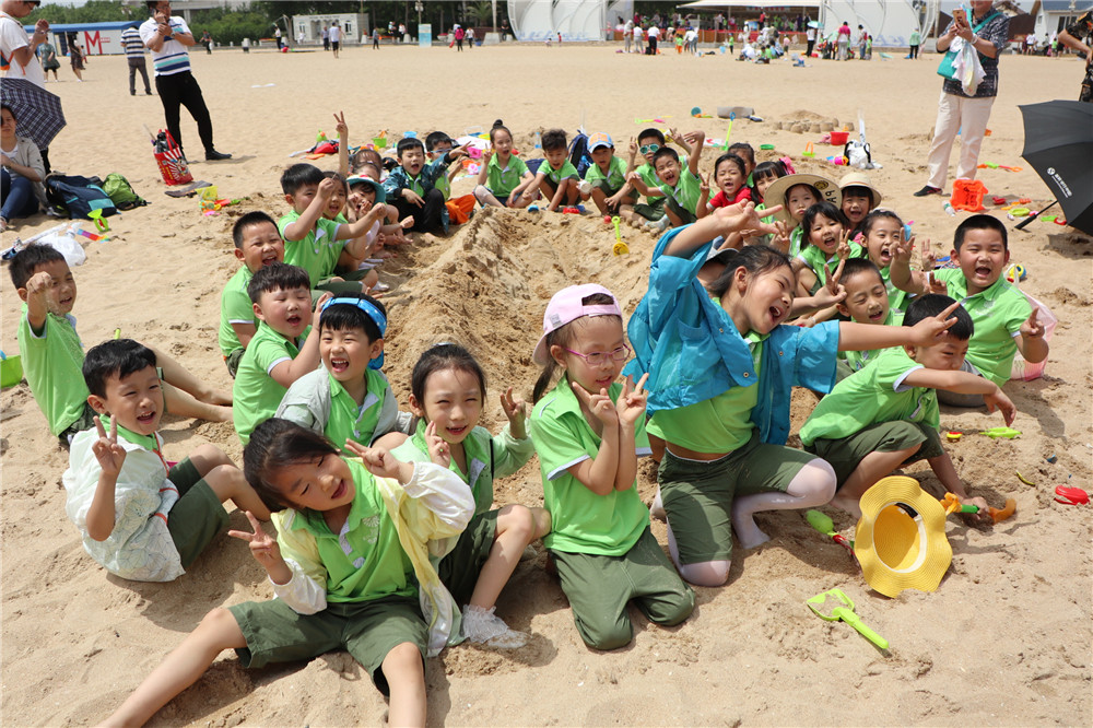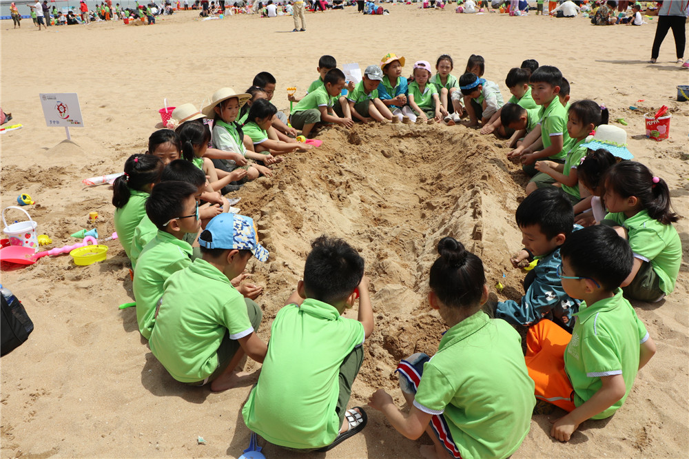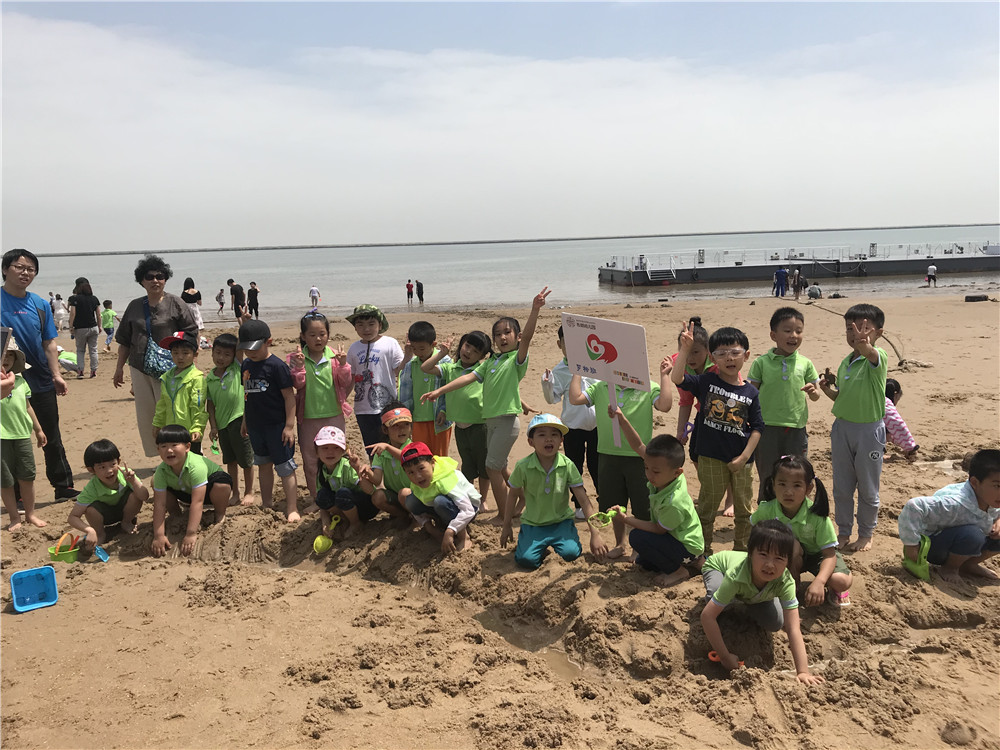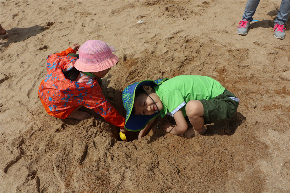 今天的东疆港沙滩上,到处是天津泰达布朗幼儿园的小朋友们可爱的身影,他们用工具、用双手神情专注的忙碌着。罗伊班小朋友一起合作共筑“长城”,罗格班小朋友齐心协力开出了蜿蜒的 “小河”,还有中班小朋友建造的“城堡”、深坑……宝贝们在游戏中,体验着沙的特性,体验着大自然回馈给他们的快乐,在合作中培养着互相协作的集体意识,释放着成功后的自信。