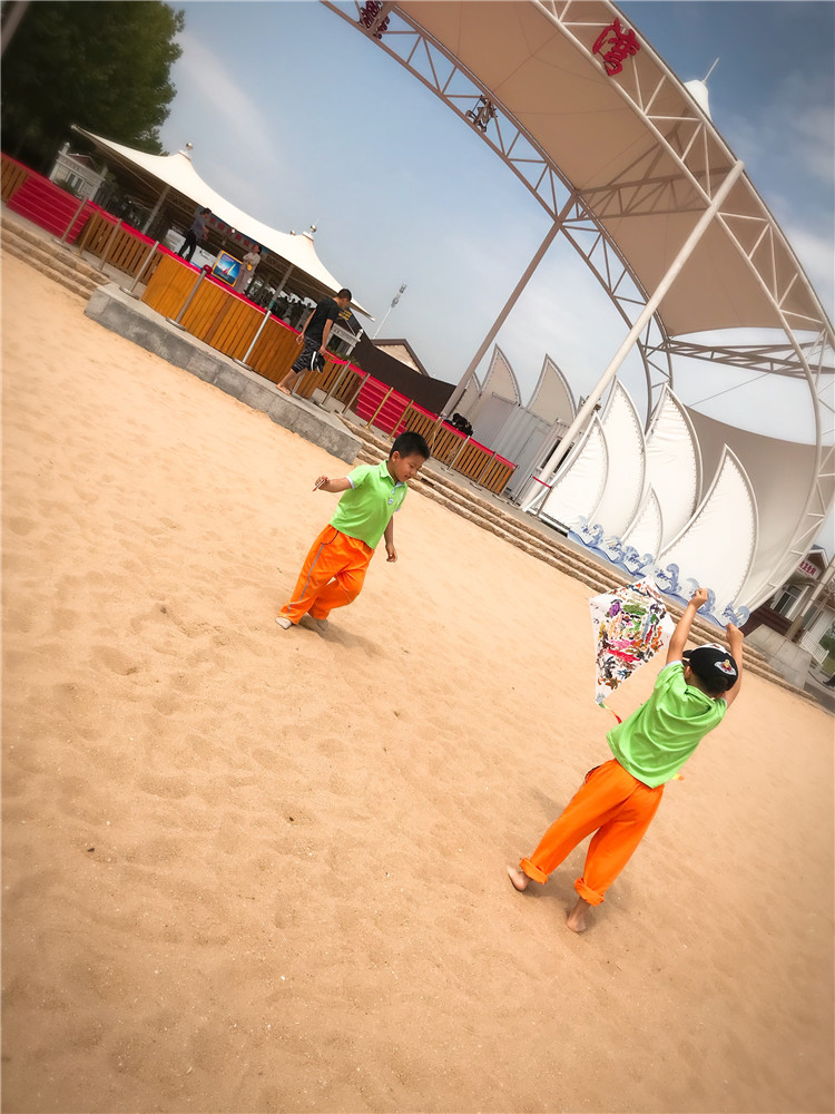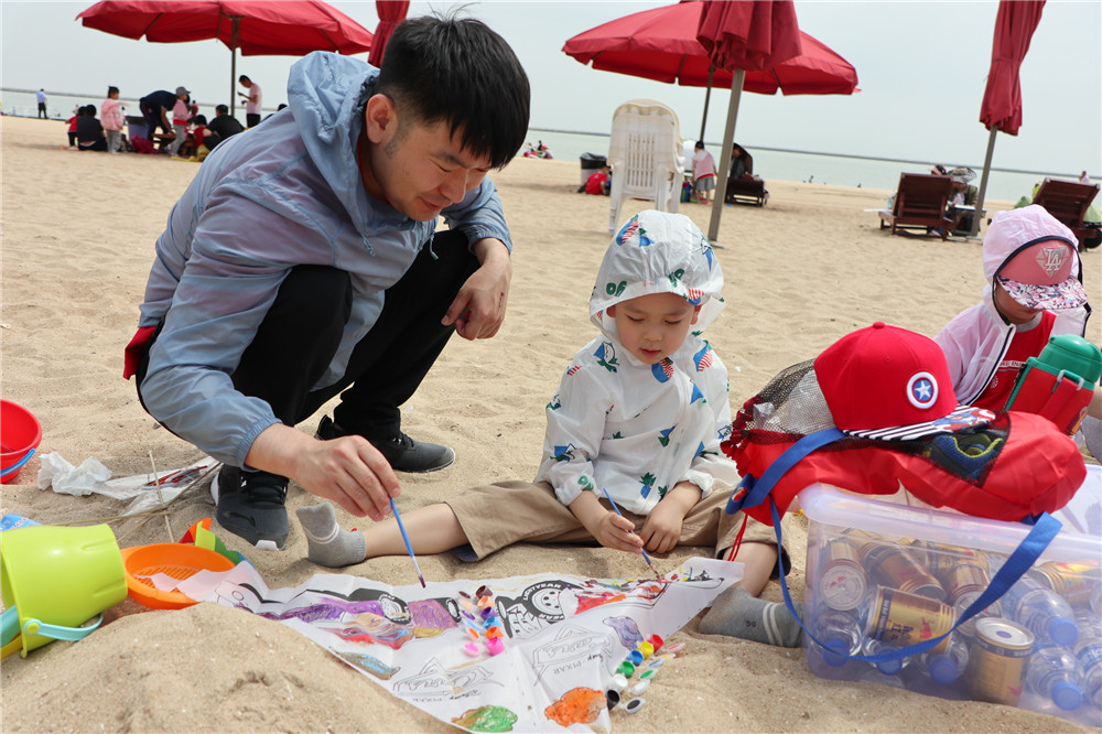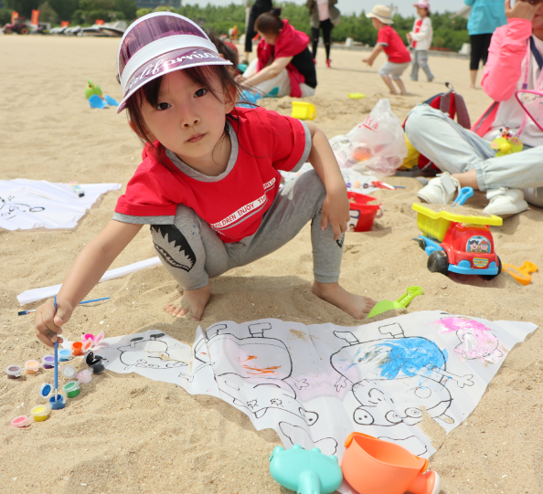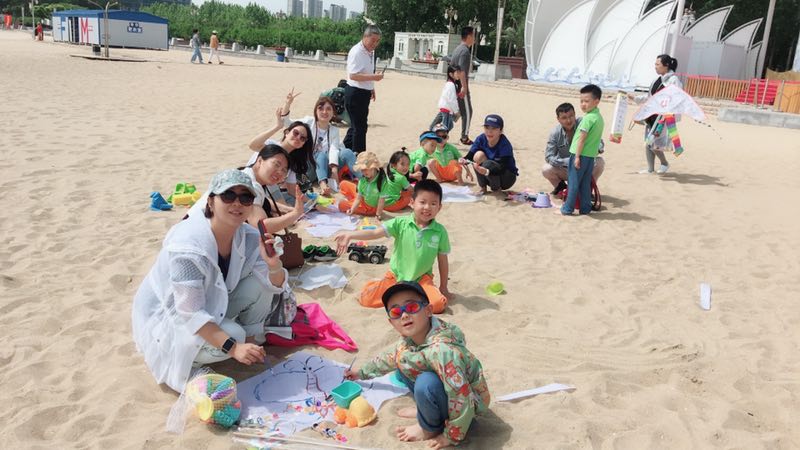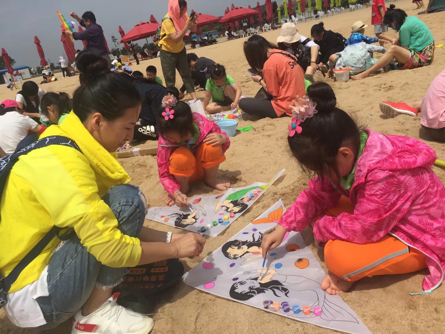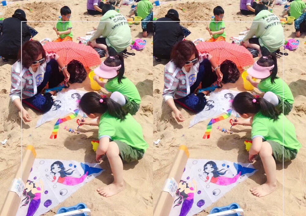 放风筝是我国民间传统文化。民国年间,“风筝魏”是天津风筝制作最为杰出的代表,至今天津人仍然喜欢以放风筝的方式休闲、娱乐。今天,玩够沙子的宝贝们和爸爸妈妈一起在阳光下,以细软的沙滩为创作基地,以无色的风筝为画板,或坐或趴,兴致勃勃地一起忙碌起来。他们挥洒着五彩斑斓的水粉,用笔表达着自己的美好愿望。