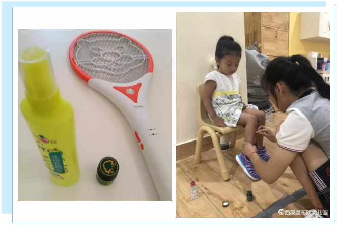 班级老师们全力以赴做好登革热预防工作,开展“搬家式”卫生大扫除,做到无卫生死角、无脏水积留、无蚊蝇滋生,为宝贝们创设良好的卫生环境。并准备电蚊拍、驱蚊油、花露水和青草油,贴心护卫宝贝们的健康。
