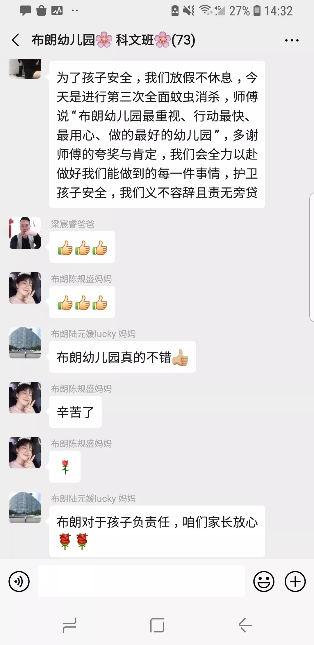 布朗海口西溪里园积极行动,尽心致力地守护宝贝们的健康,赢得家长们和消杀工作人员的称赞好评!