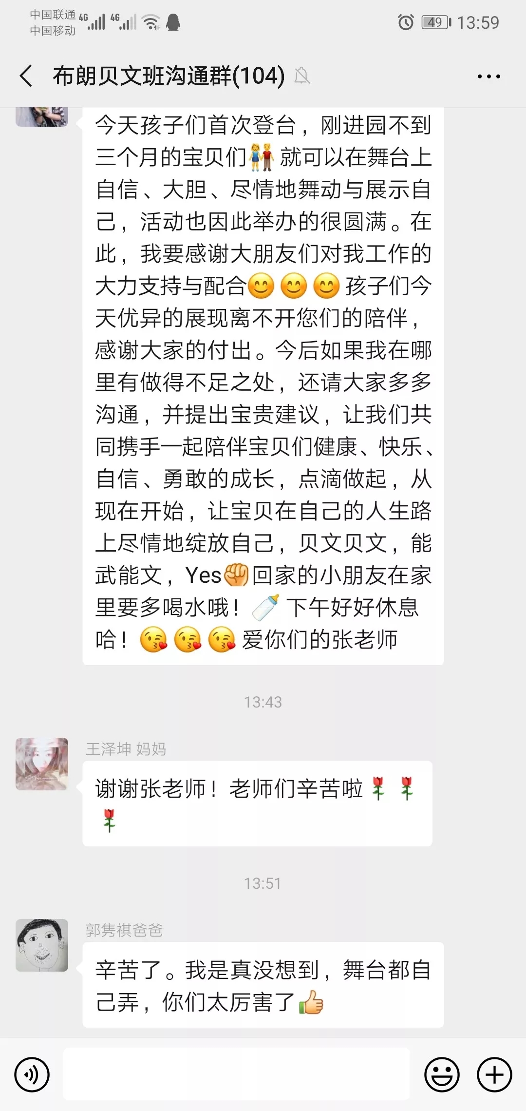 此次活动,我们邀请全园家委参加,家委们白天上班,晚上要来幼儿园彩排,真的实现了“家委家委,为爱无悔”的目标!一曲《我和我的祖国》将活动推向了高潮,家委们用爱和时间来为活动助力,为孩子打CALL,家委们用他们的实际行动,表达着对祖国深深的爱!