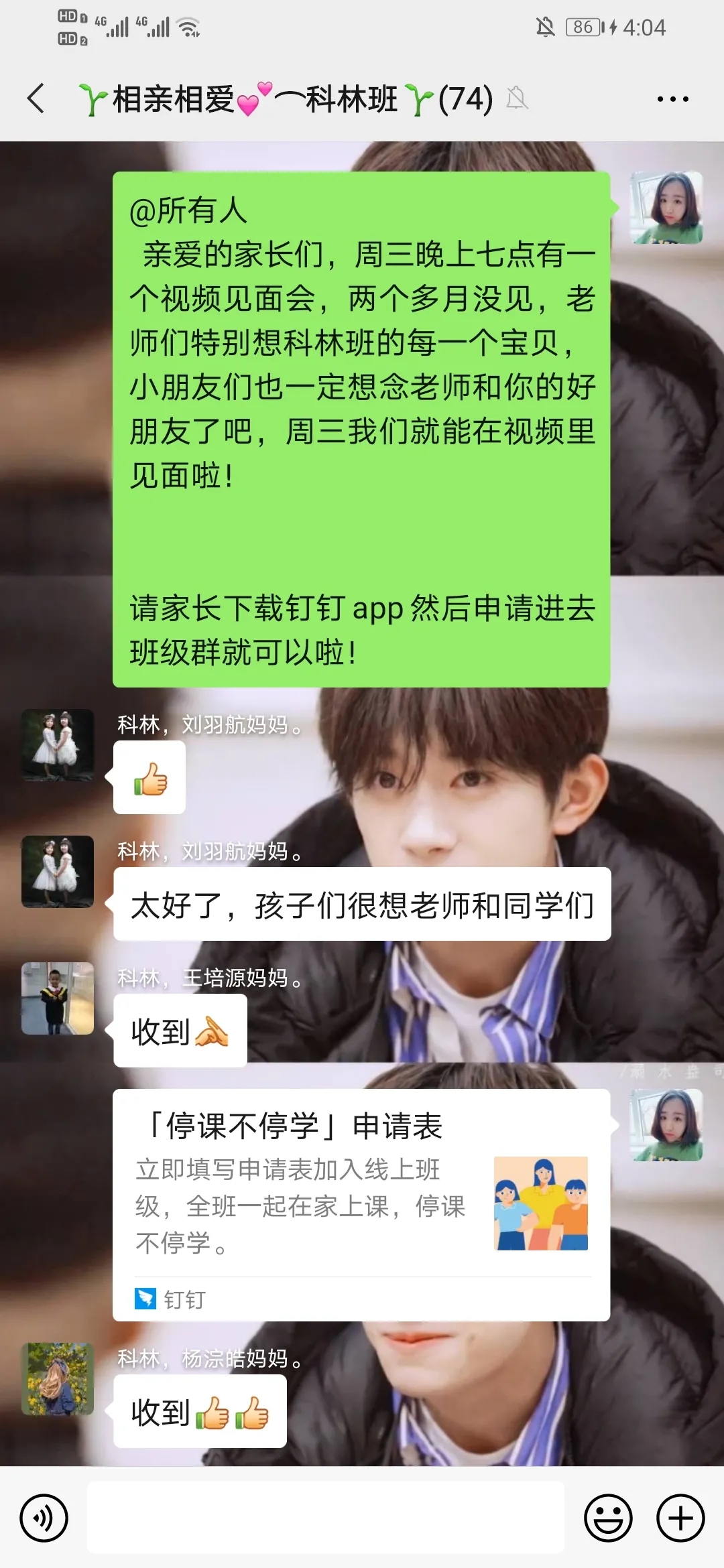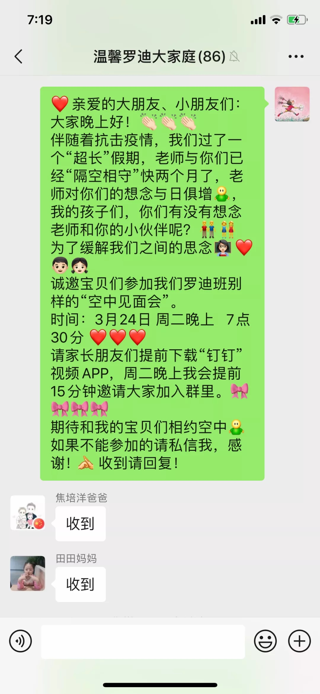 考虑到大部分家长已经陆续复工,为了确保空中见面上所有的孩子们都能加入进来,各班在选择活动时间上基本考虑到幼儿家庭的合理安排时间,征求家长们意见,安排在晚饭后,既不影响幼儿家庭正常流程也能让家长们、孩子们一同参与。