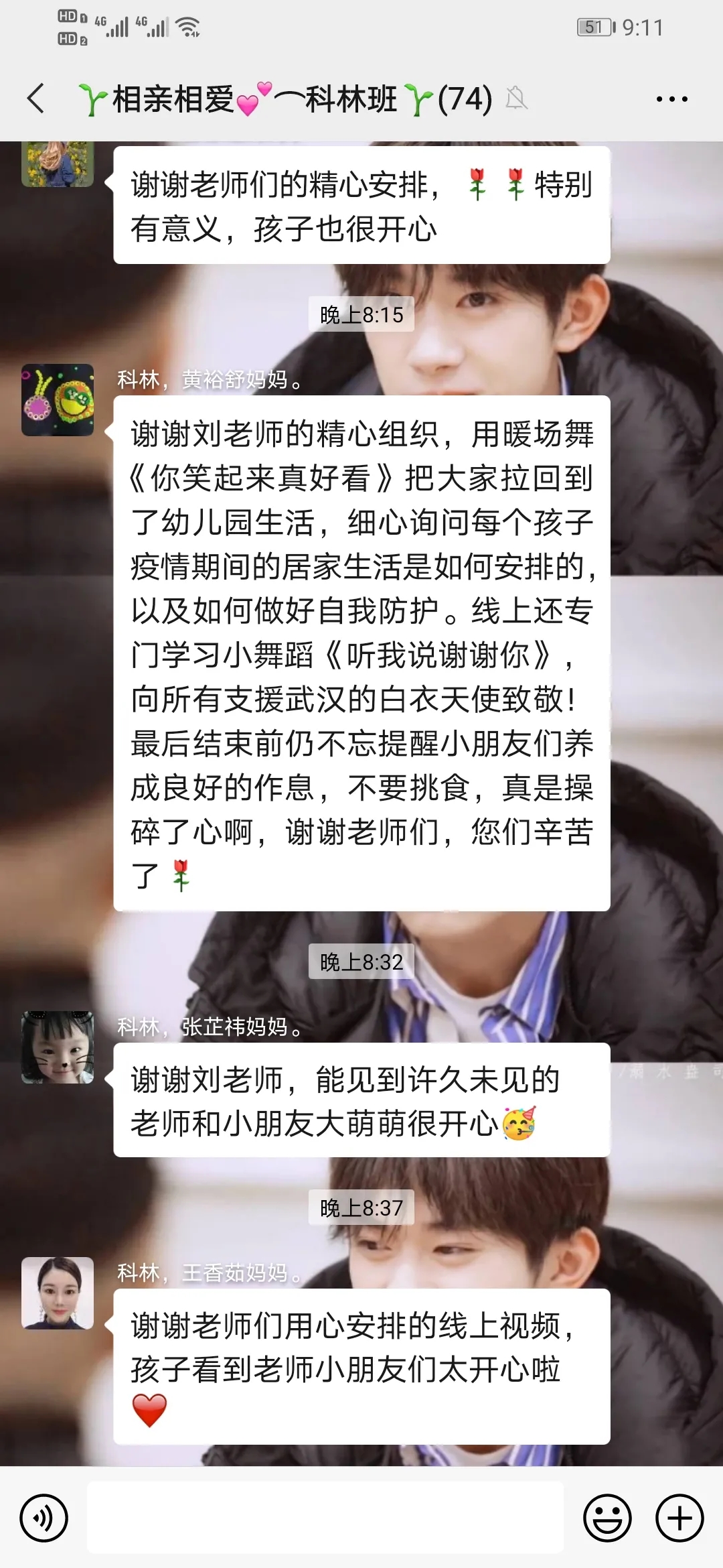 空中见面会开展的顺利、精彩,这离不开老师的努力,家长的配合,正因为有家长们默默的支持才让园所安排的所有活动圆满成功的进行,老师们所付出的一切也都是值得的。疫情凶猛来袭,把本来风和日丽的春景影响,但却不能阻碍我们拉进彼此距离的脚步,隔着屏幕我们能感受到浓浓的思念之情,因为有一个个包容大爱的家庭在背后默默支持,因为有一张张可爱的笑脸值得我们付出。