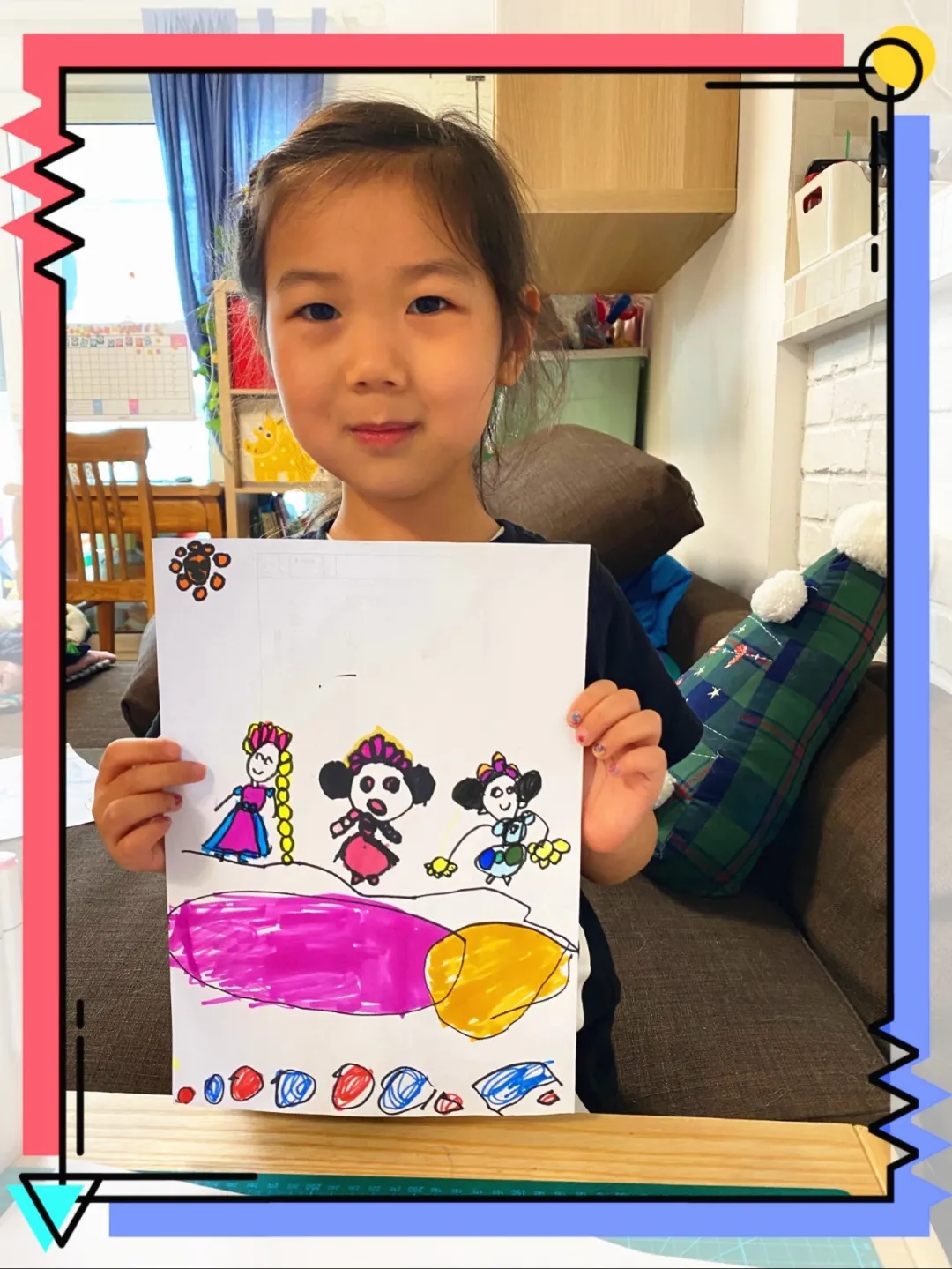 在我的创意画里,我的辫子是用圆形画出来的麻花辫,太阳也是圆形的,下面还有一些圆形的彩色小石头。