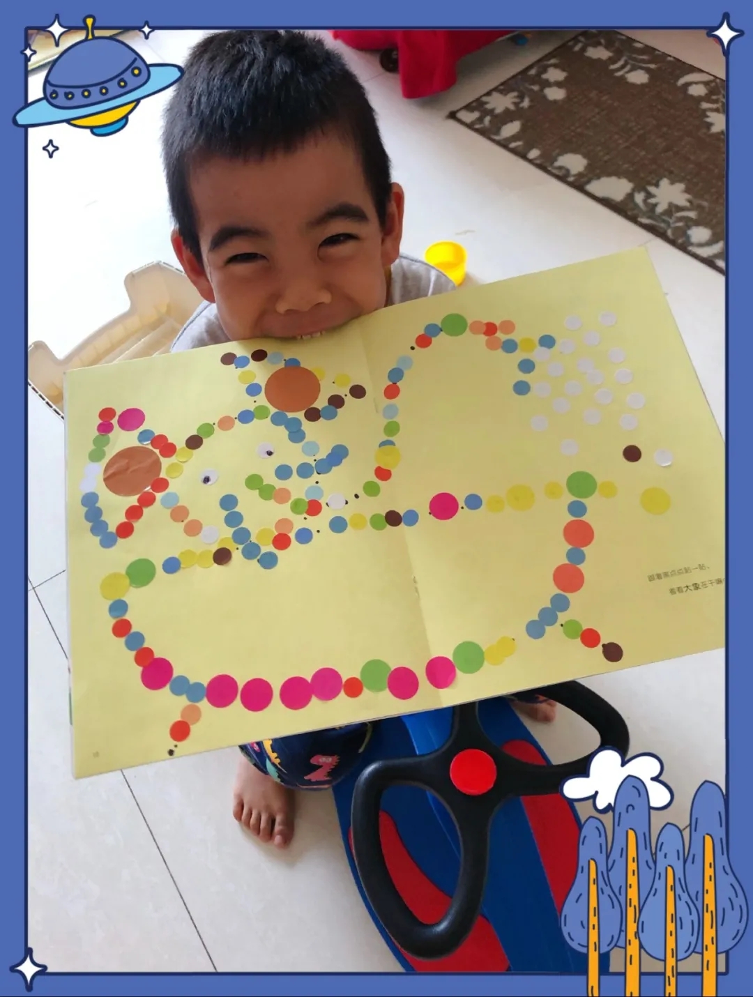 我的作品是小象在洗澡,我用的是圆形贴纸贴出来的作品。