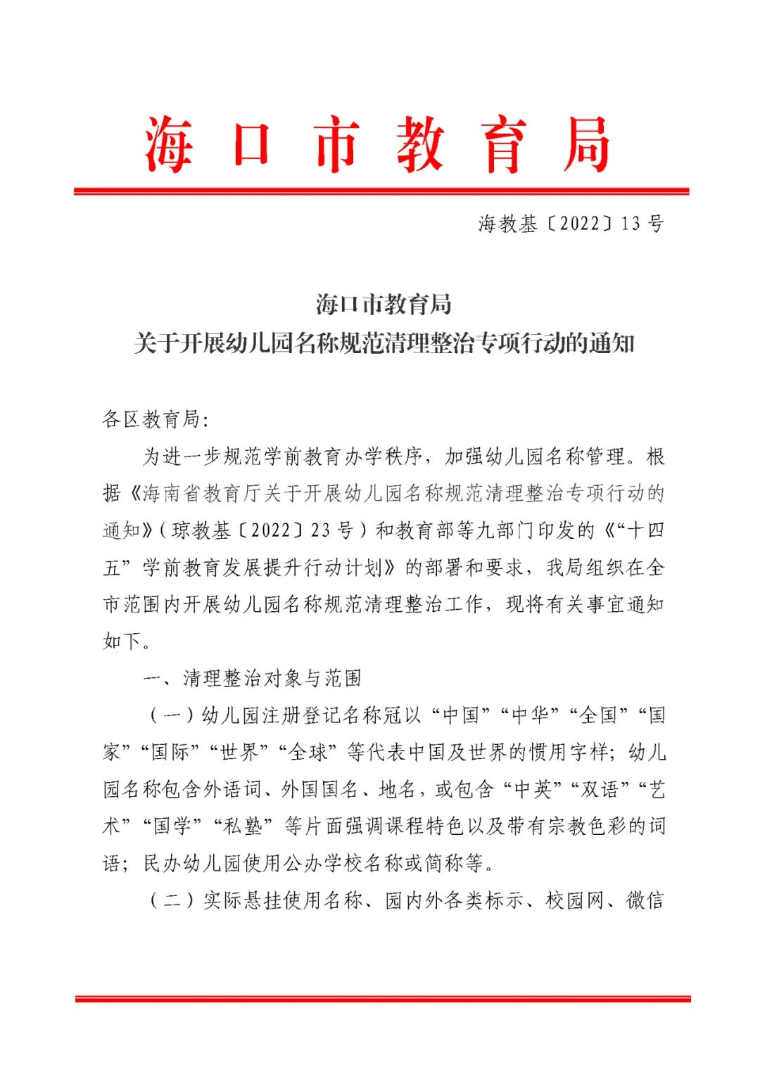 大家好!根据海教基〔2022〕13 号文件精神,针对幼儿园名称包含外语词、外国国名、地名;民办幼儿园使用公办学校名称或简称等进行清理之要求,海口市布朗幼儿园响应政府号召,并报请北京布朗教育机构、报请上级政府相关部门,认真履行相关手续,现将“海口市布朗幼儿园”更名为“海口市井德幼儿园”。目前已完成:办学许可证更换、民办非企业单位登记证以及工商、税务、银行相对应的证件。标识、校牌、校园网、公众号等相匹配名称也在陆续完善中,请各位家长朋友们和社会各界关注海口市布朗幼儿园发展的朋友们知悉。