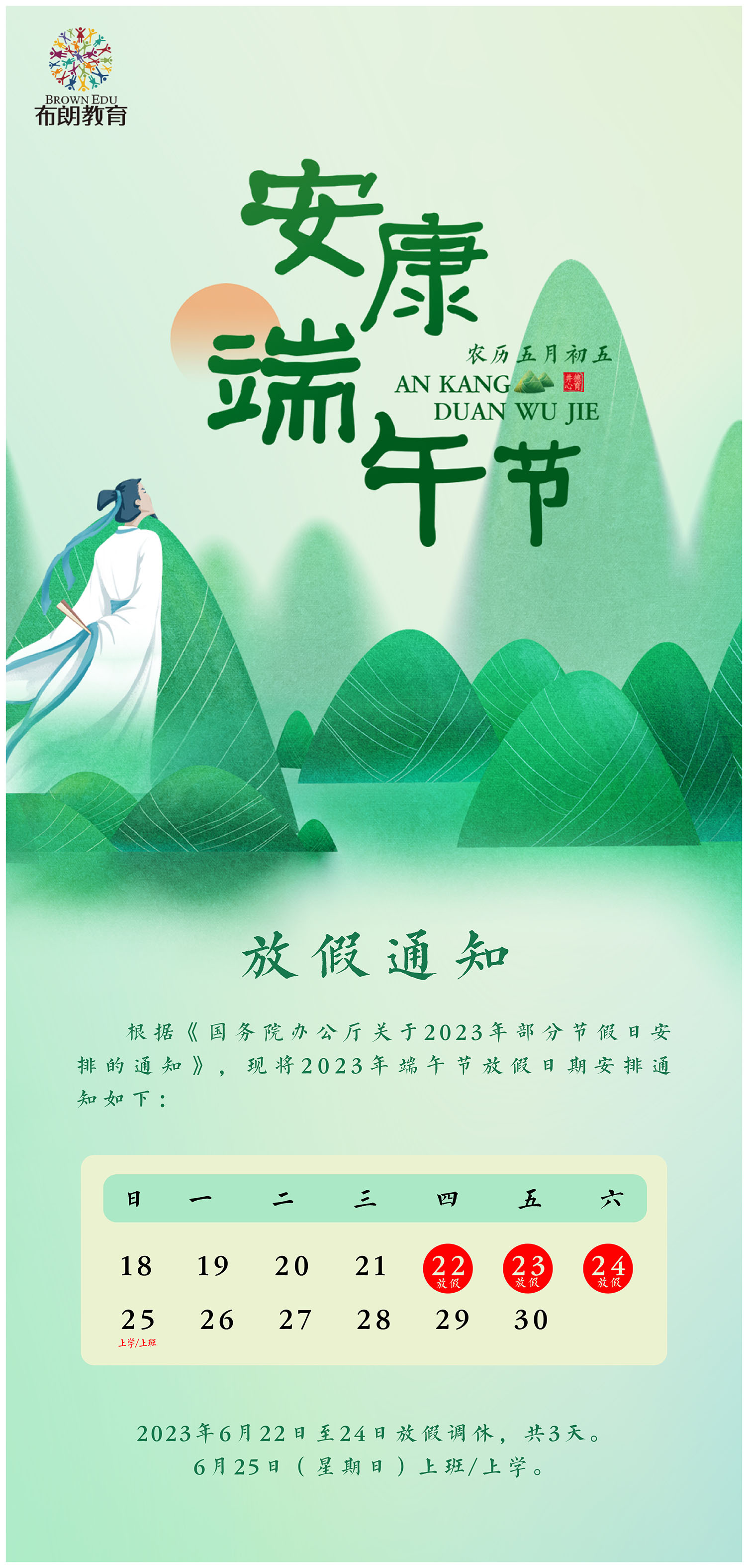 中国四大传统节日之一端午节即将来临,为了让您的孩子度过一个充实平安的假期,现将放假时间安排及注意事项通知如下,请家长配合做好孩子的监护、教育工作,度过一个有安全、有意义的假期!