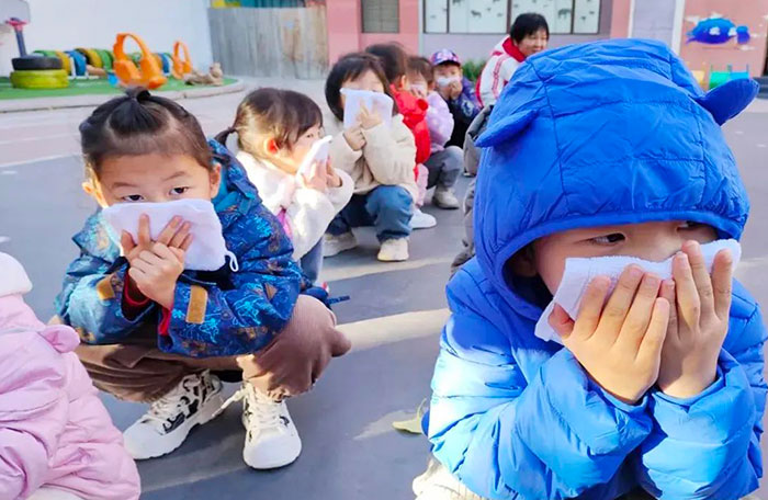 全园师生有序按紧急预案的疏散线路,拿起湿毛巾,捂住口鼻,弯着腰快速撤离到空旷地。演练中,孩子们安静、迅速且井然有序。整个疏散活动用时2分40秒,为保证生命安全争取了有效时间。