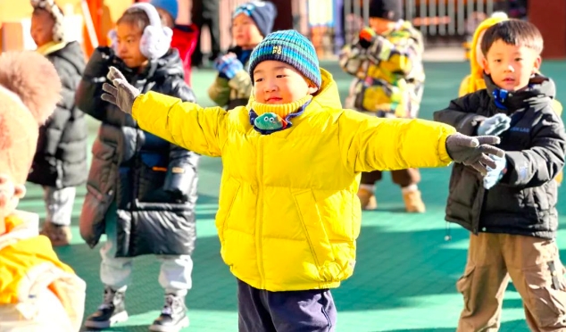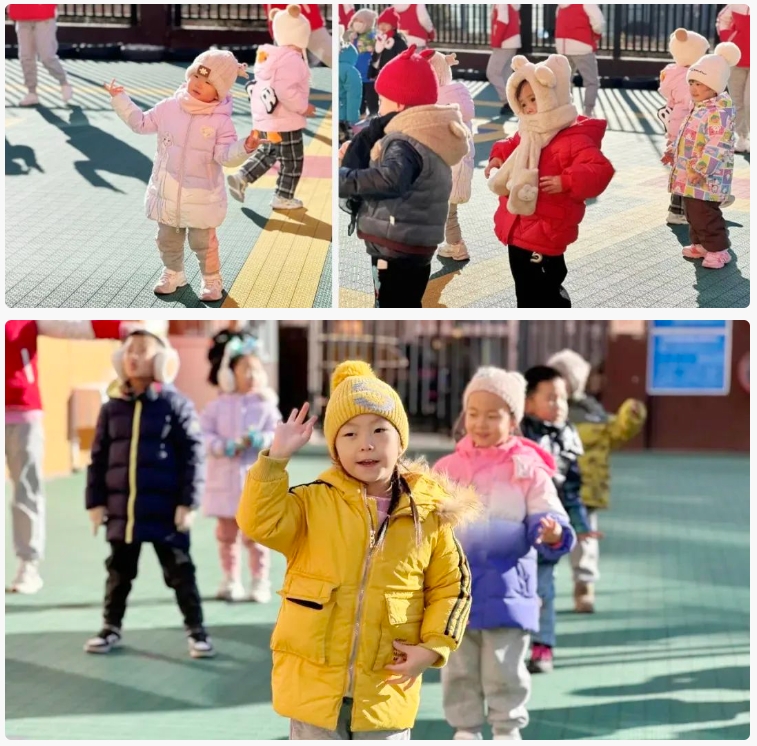 布朗幼儿园大同魏都B园的老师们根据《指南》中有关幼儿动作发展的目标,巧妙地利用园内场地和体育器材,在冬天带着萌娃们一起动起来!