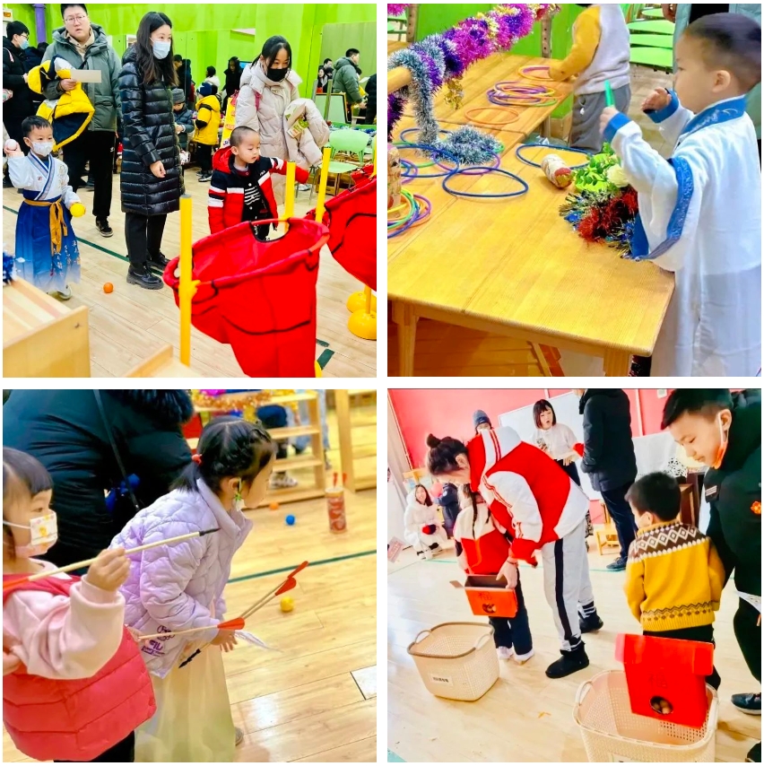 庙会分为民俗工坊、传统游戏、美食部落三个主题,共设有14个场馆。孩子们拿着庙会集章卡在美食部落里包饺子、串糖葫芦、品尝爆米花、红枣糯米团,感受制作传统小吃的乐趣。经典民间游戏投壶、套圈、金龙抖福也吸引孩子们接踵而至,真正体验了一把穿越时空的妙趣。