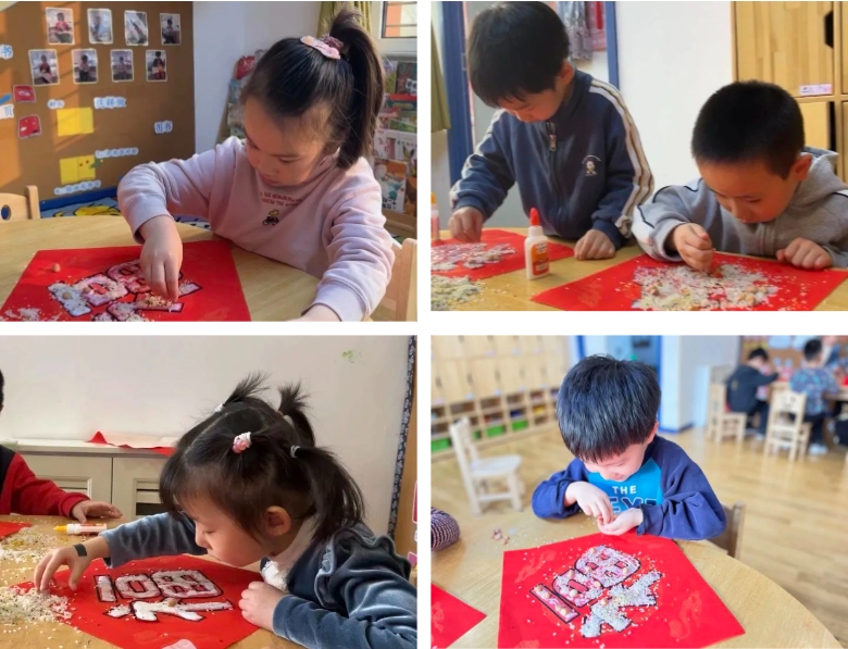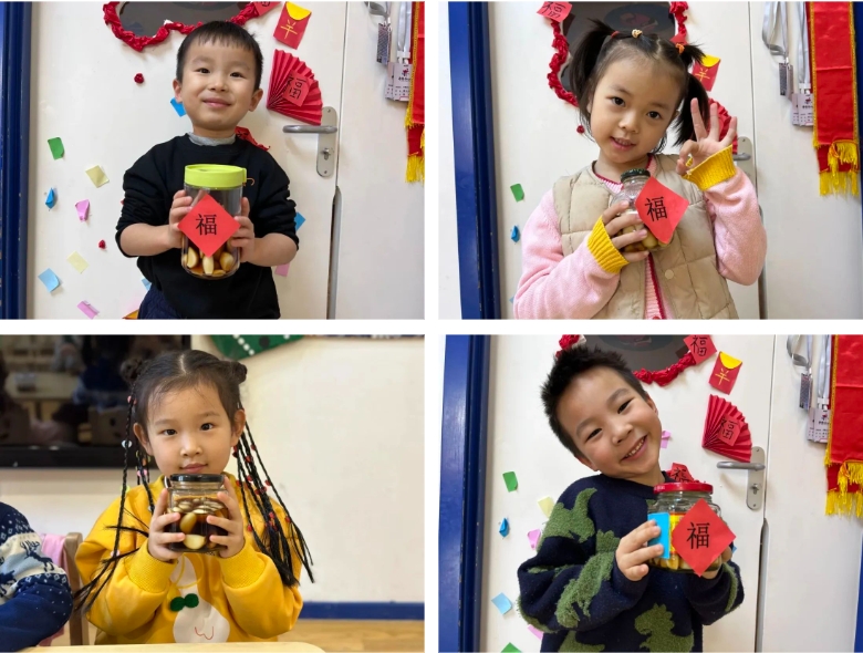 过了腊八就是年,小朋友们用五谷粘贴了福字,寓意着五谷丰登、送吉祥,送祝福。2024年福气满满。