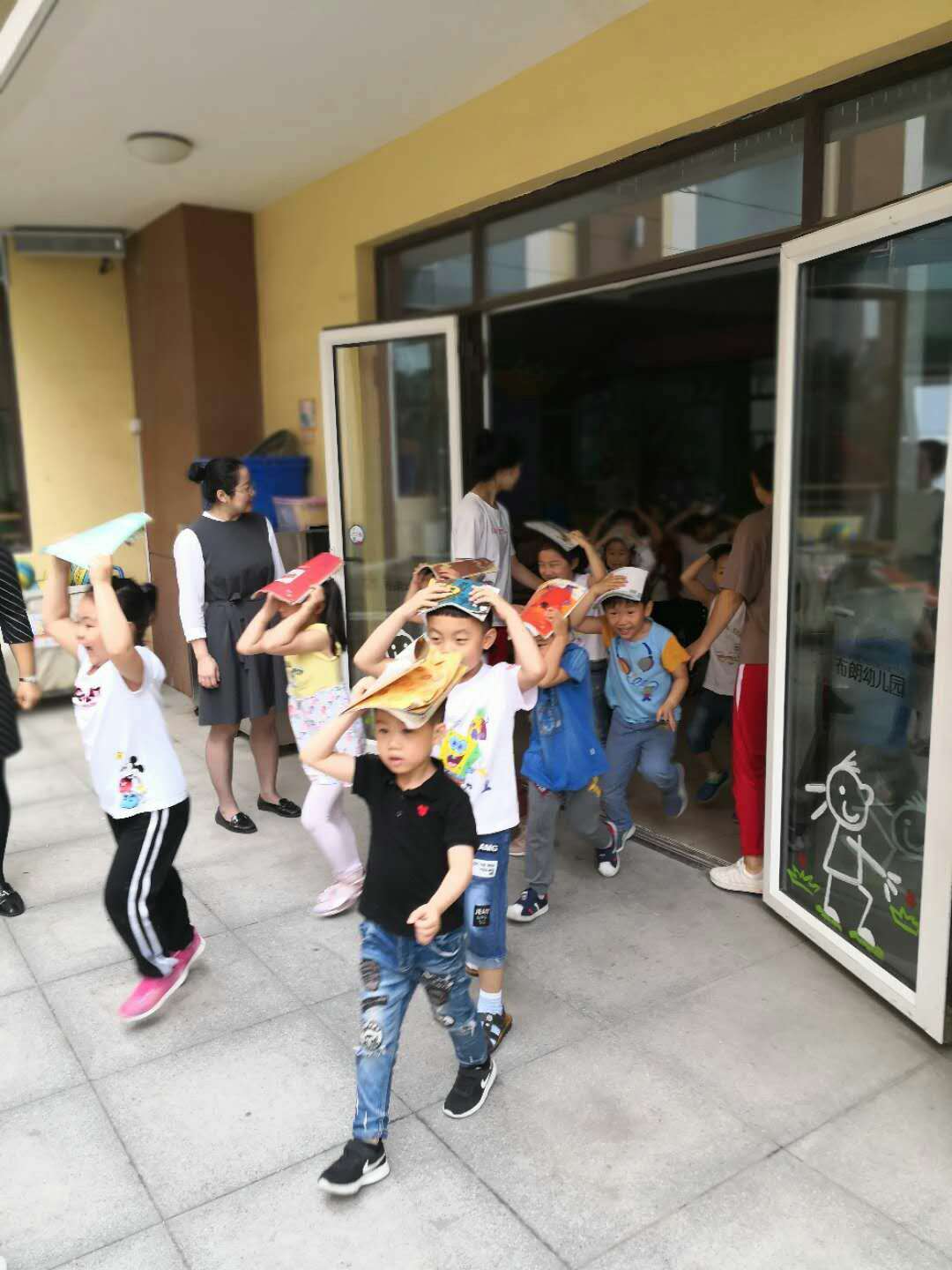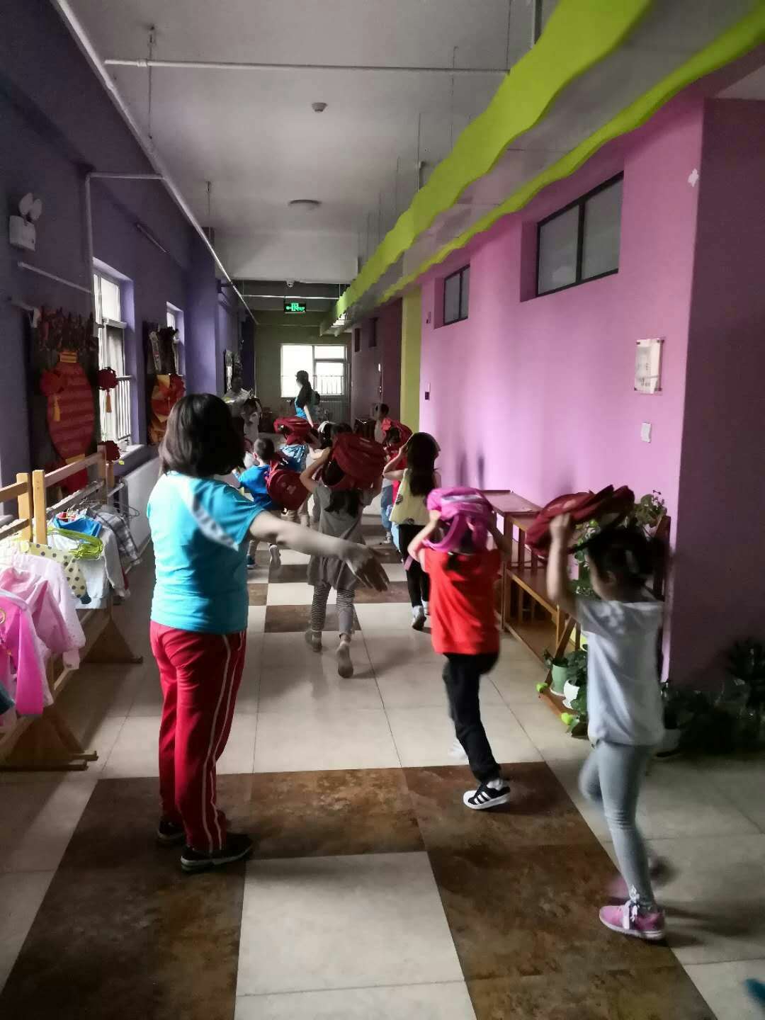 随着第一次警报声的响起,防震演练开始。各班教师快速到位,立即告诉幼儿“地震了,不要慌”,并指挥幼儿紧急避险,指导幼儿双手护头,或者用书包护头,到角落躲避。