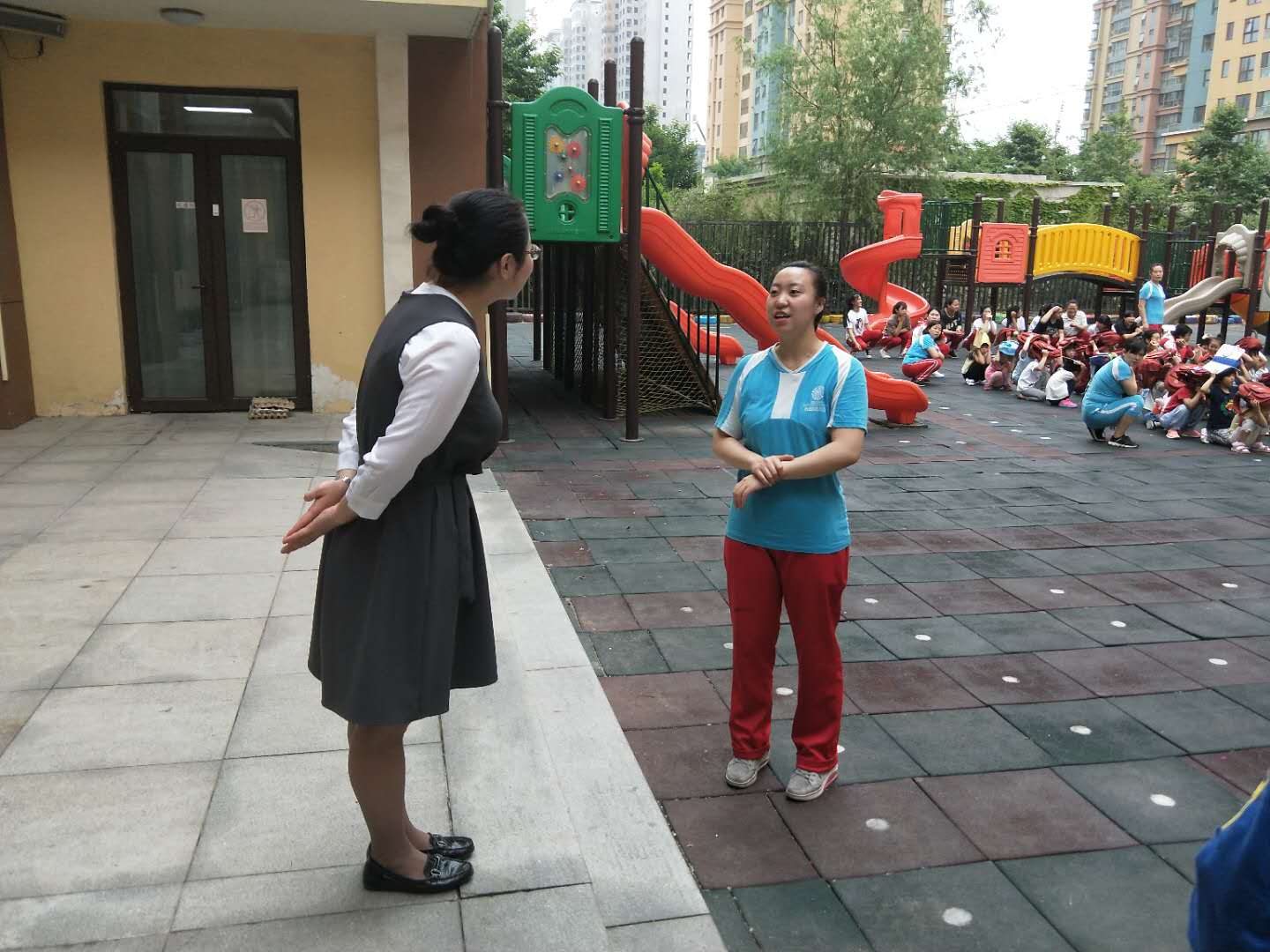 第二次警报响起,各班老师组织孩子有序撤离到户外安全地带。在撤离的过程中,孩子们听指挥、有秩序、不慌张,快速安全到达空旷场地。