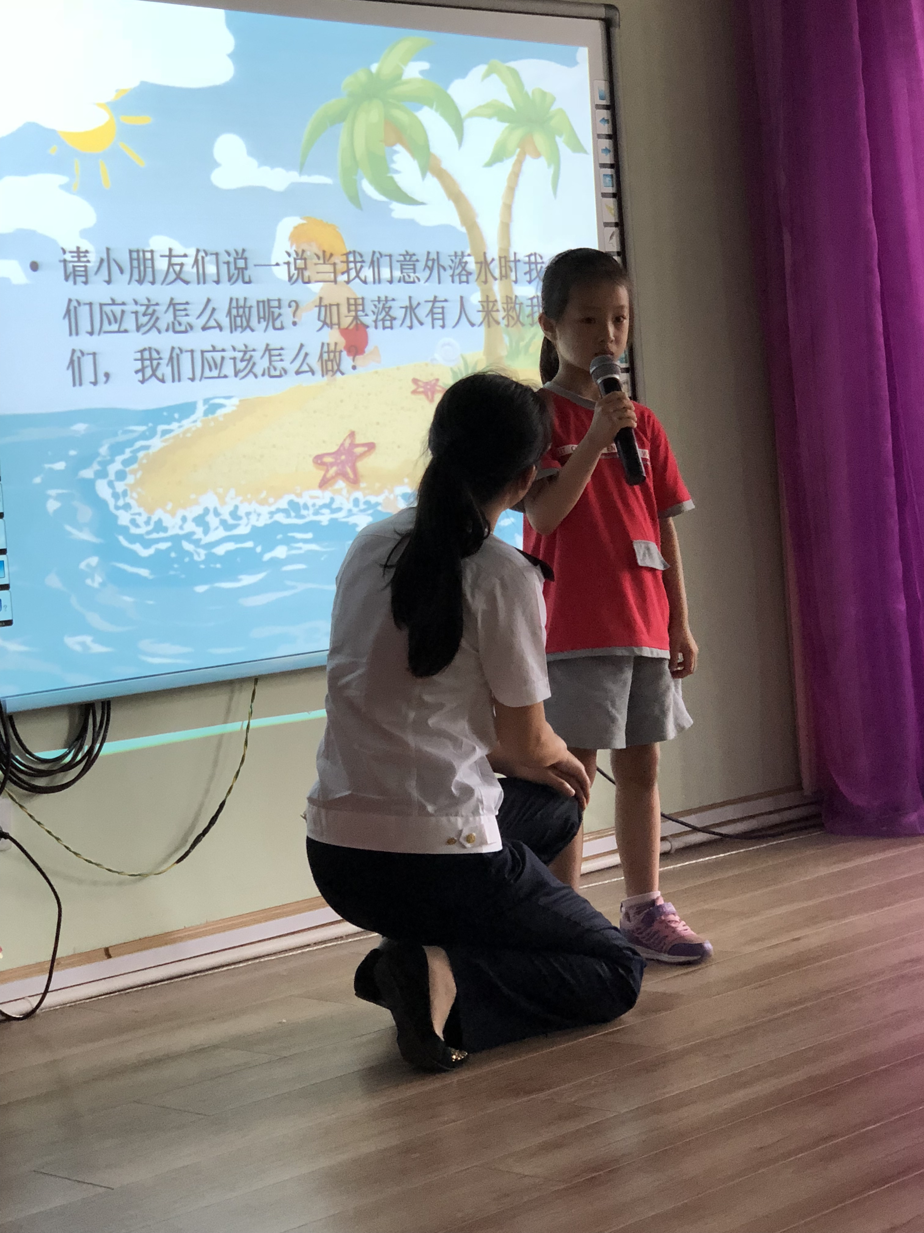 最后授课老师通过问答的形式让小朋友巩固了今天所学到的知识,小朋友积极参与,踊跃作答,所有人都得到了授课老师的奖励。在欢声笑语中,我们愉快地结束了这次“防溺水安全教育”活动。
