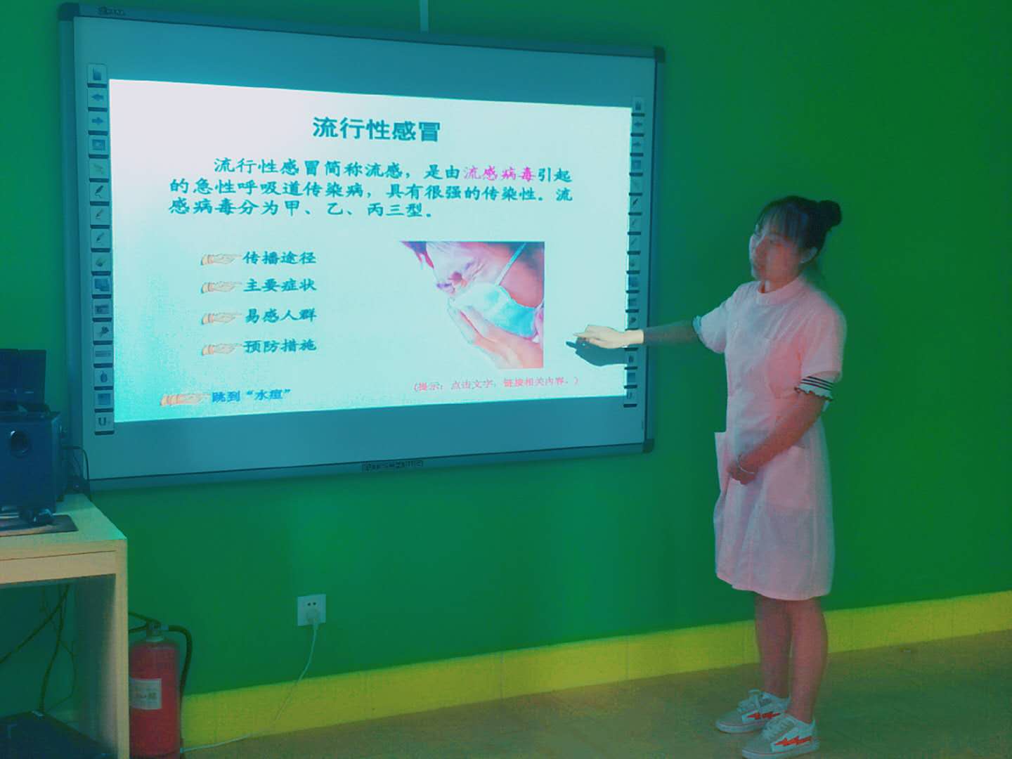 本次培训有保健医生毛园园主讲。毛医生利用PPT课件,结合案例,形象直观地讲解了流感、麻疹、流行性腮腺炎、水痘等秋季常见呼吸道传染病的传播途径、常见症状及预防方法;并请各班教师落实好班内晨检制度,密切注意班内幼儿的身体情况,及时发现传染病疑似病例,做到“早发现、早隔离、早治疗”。