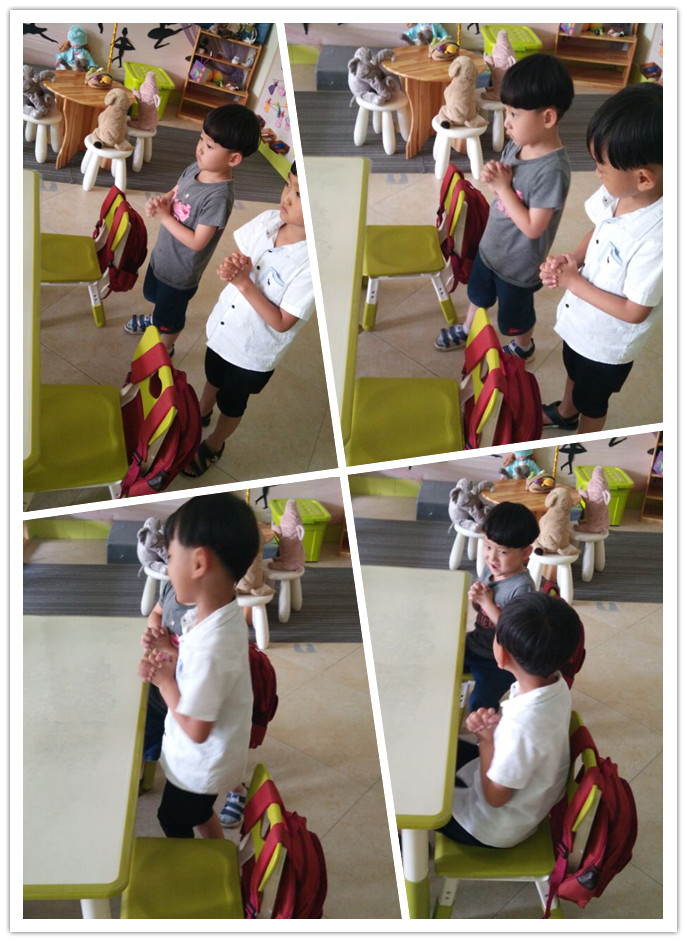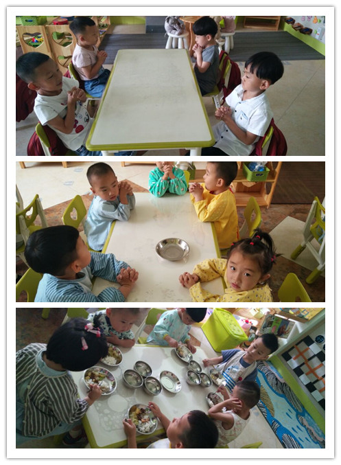 孩子们洗手后,进餐前,手是不可以接触任何物体的,老师们细心地为孩子们摆放好椅子,孩子们会从侧方直接入座,不再用手接触椅子及桌面。