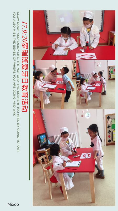 孩子们把自己打扮成医生的模样,给同伴检查牙齿,以情景再现的模式,让自己和身边的人意识到牙齿健康的重要性。