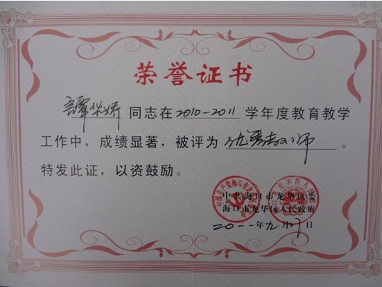 恭贺:谭华娇老师在2010-2011学年度教育教学工作中,被评为“龙华区优秀教师”!
