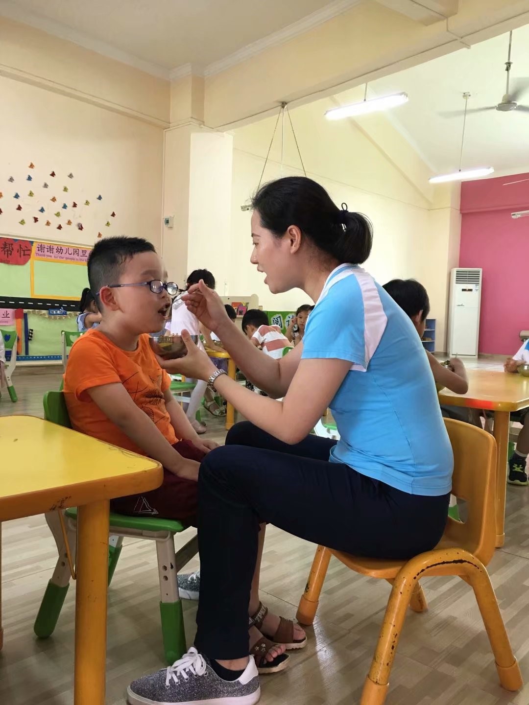 对于小班的孩子来说,吃饭和睡觉的常规培养本来就很难,更何况是对于超超这个特殊的孩子,那真是难上加难!怎么办呢?没有退路让湛莉走,只能向前走!湛莉当时采用了慢慢浸入式的方法。超超只吃鱼肉加白米饭,而且还是一口鱼肉喝一口汤,再来一口米饭喝一口汤,其它任何东西他都不吃,所以他妈妈每天都会给他带鱼肉。湛莉就先从他喜欢吃的东西入手,爱吃鱼就鼓励他多吃点,不喜欢吃的,每次就尝一点点。就这样湛莉和班上的老师们每天每顿轮流着手把手地给超超喂饭坚持了半年,之后又教他勺子怎么握,饭碗怎么拿。因为超超不愿意自己学习怎样吃饭,所以一教他吃饭他就开始发脾气,丢碗勺。但是湛莉从没有失去耐心,他丢了多少次,她就捡了多少次。总之,她想尽各种办法来鼓励他喜欢上自己动手吃饭。
