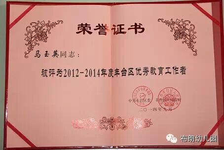 昨日在丰台区委、丰台区政府获知喜讯:我园保健医马玉英老师被丰台区委、丰台区人民政府评为“2012-2014年度丰台区优秀教育工作者”的光荣称号。