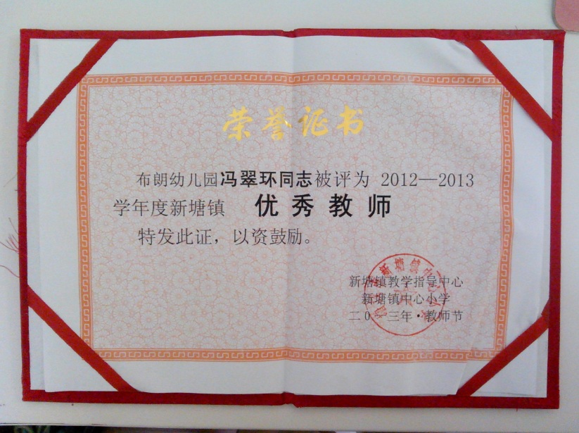 恭贺:冯翠环老师被评为“2012-2013学年度新塘镇优秀教师”!