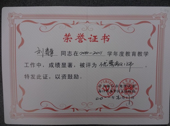 恭贺:刘静老师在2010-2011学年度教育教学工作中,被评为“龙华区优秀教师”!
