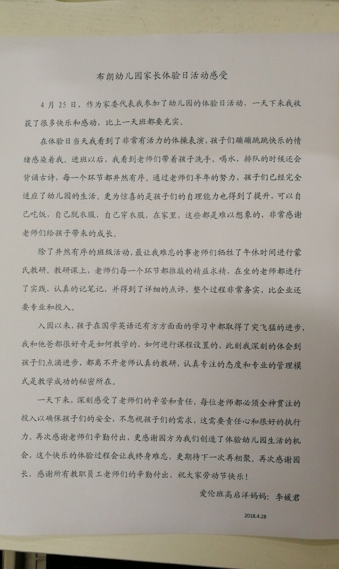 家长体验日活动的开展缩短了幼儿园与家长之间的距离,让家长更加全面地了解了幼儿园的教学方式、生活动态,提高了幼儿园管理透明度,为将来更好的沟通和交流搭建了平台。此次活动,也赢得了家委对园所工作的支持、体谅和赞扬,布朗的老师们很欣慰,但同时更会对自己的工作提高要求,不负期望!布朗幼儿园将不断努力提高幼儿园的办园质量和口碑,为共同实现“让儿童拥有世界”的愿景不断努力!