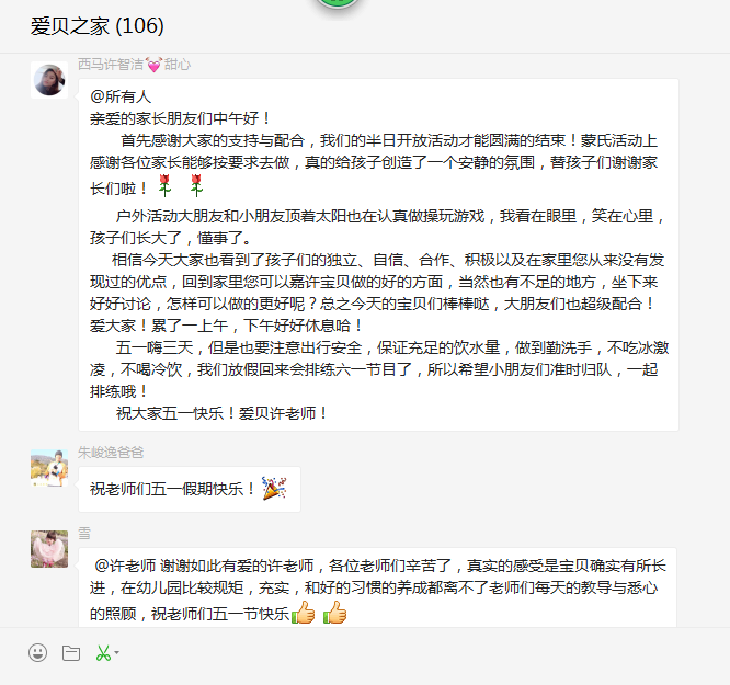 活动刚结束,就有不少的家长在班级的微信群发布信息,感恩老师的辛苦付出,感谢幼儿园呢!家长们的一句感谢,一句肯定,让我们倍感欣慰,是我们的动力,作为老师的我们虽然累着,却也快乐着、幸福着!我们依然会一如既往,再接再厉,砥砺前行,陪伴着孩子们一同成长,为更好的明天不懈奋斗!