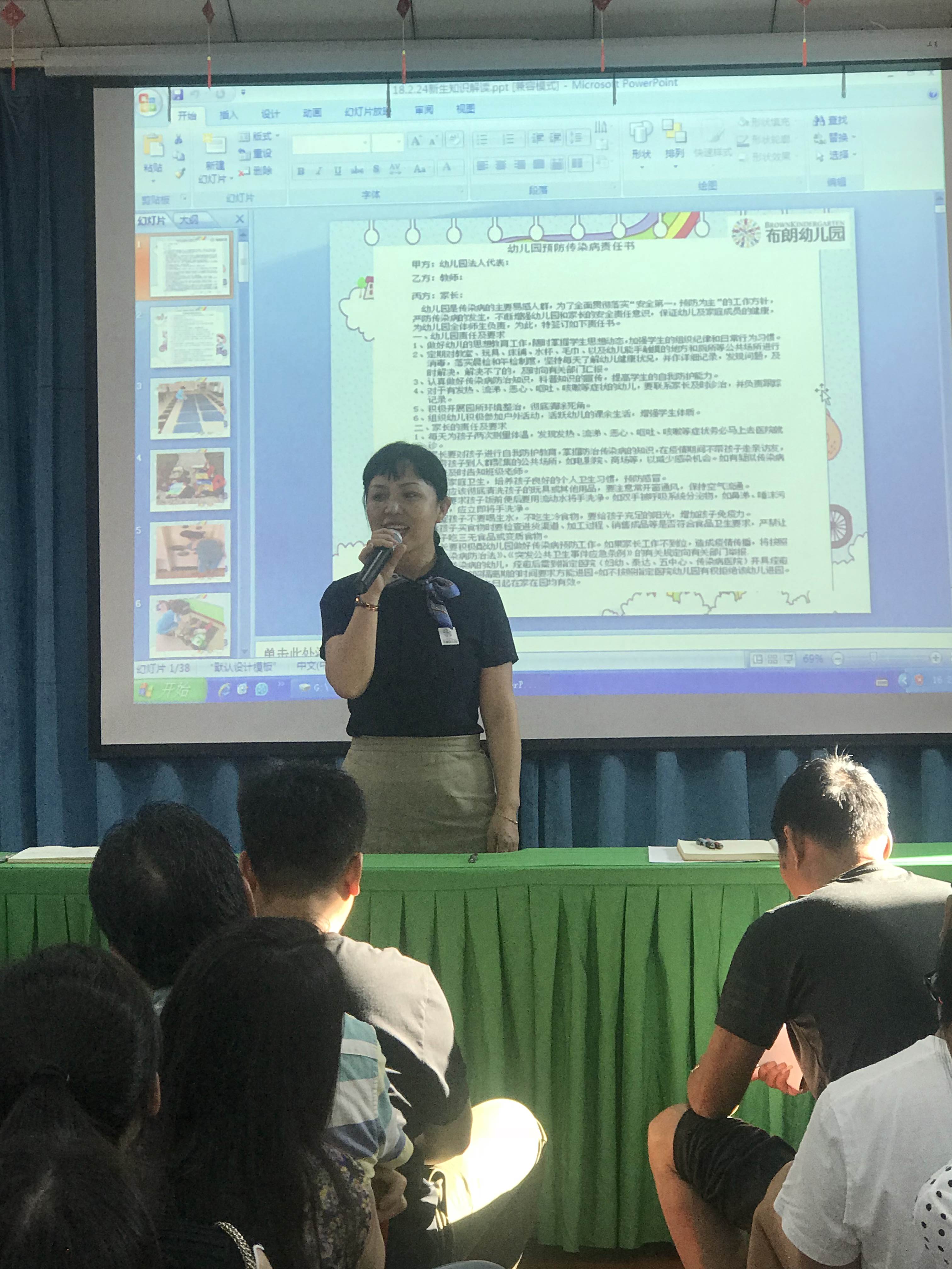 孩子的安全维系着众多家庭的幸福,是幼儿园工作的重中之重。后勤主任从家长最关心的食品安全、物品安全等方面分享了布朗教育规范化、精细化的安全管理工作,在大量的图片分享过程中,让家长对幼儿园食品从采购、验收、加工、消毒等一整套的流程有了清晰的了解。并从物品安全方面更做了细致、深入的讲解,对孩子入园的着装、到活动室物品摆放以及植物种类的要求和孩子离园时的注意事项都与家长们都做了分享,提高了新生家长们的安全意识。