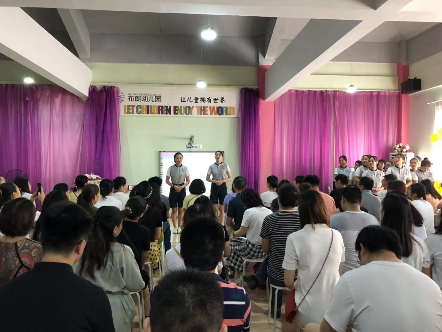 家长会分为教师亮相、暖场游戏、园长妈妈发言、茶歇、现场答疑等几个环节。首先,行政团队和新生班级教师风采亮相,展示了布朗幼儿园师资团队的激情与活力。