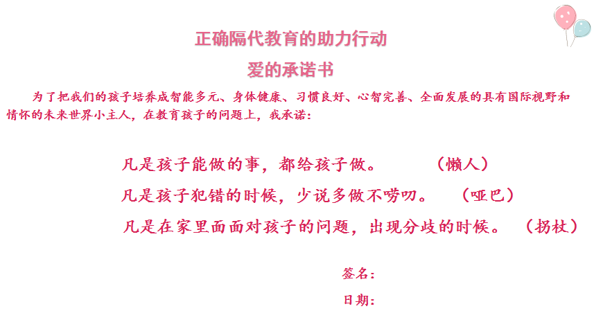 最后,为了把学习的理论和能量及时反馈和实现,为了保证所信赖的教育能够更好地执行,为了宝贝们在幼儿园和家庭中获得更加健康、和谐、快乐的成长,家长们一起签下《爱的承诺书》: