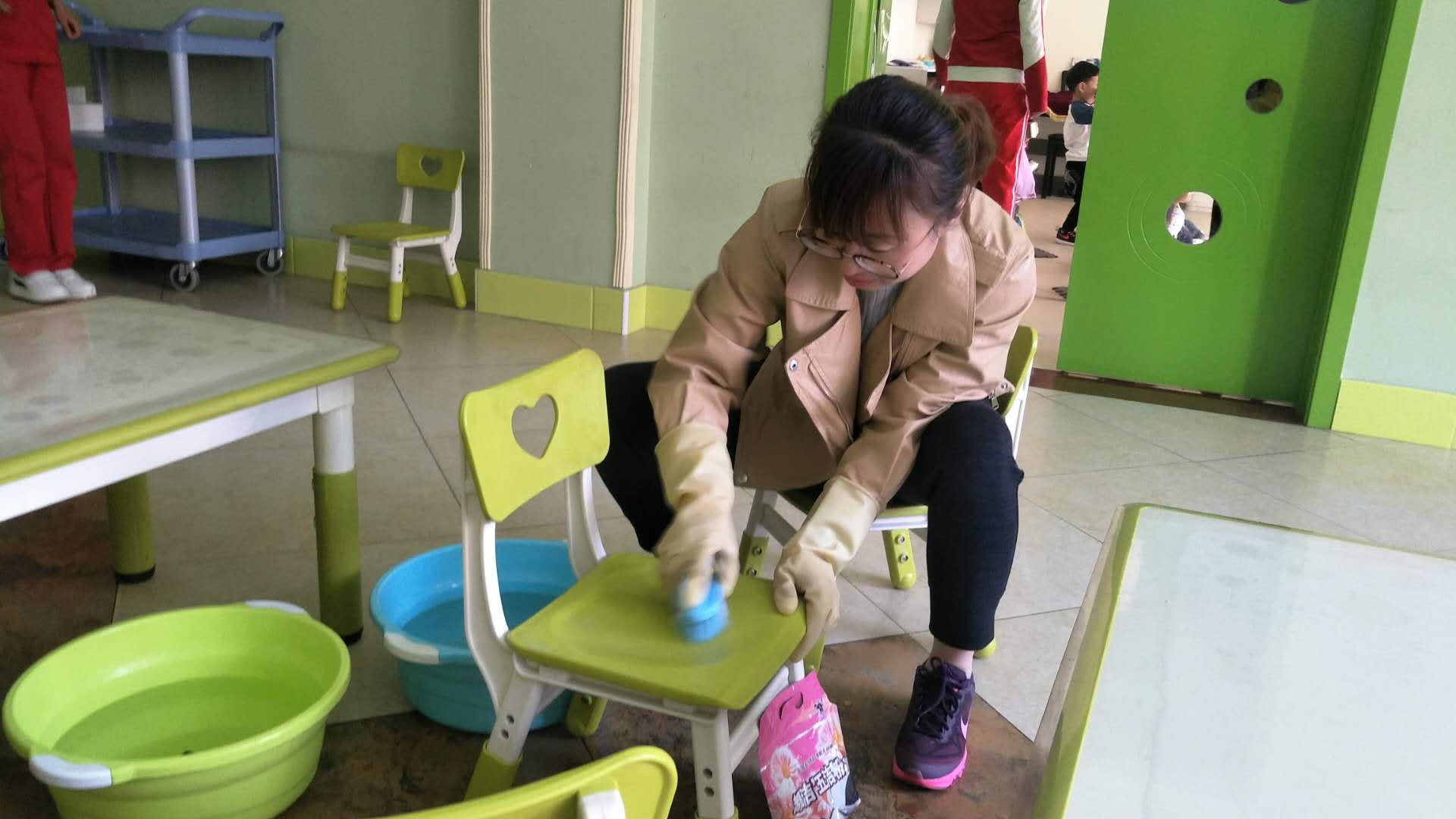 幼儿园活动中,保证环境、物品卫生的清洁、整洁是非常重要的,在布朗幼儿园中,除了每天常规的环境、桌面等卫生清理,更是细致到固定每日必须清洗、消毒的物品,比如周一是座椅、周二是桌面玩具、周三是蒙氏教具......瞧!我们的家长志愿者多么的投入,椅子边边角角都清洗消毒。