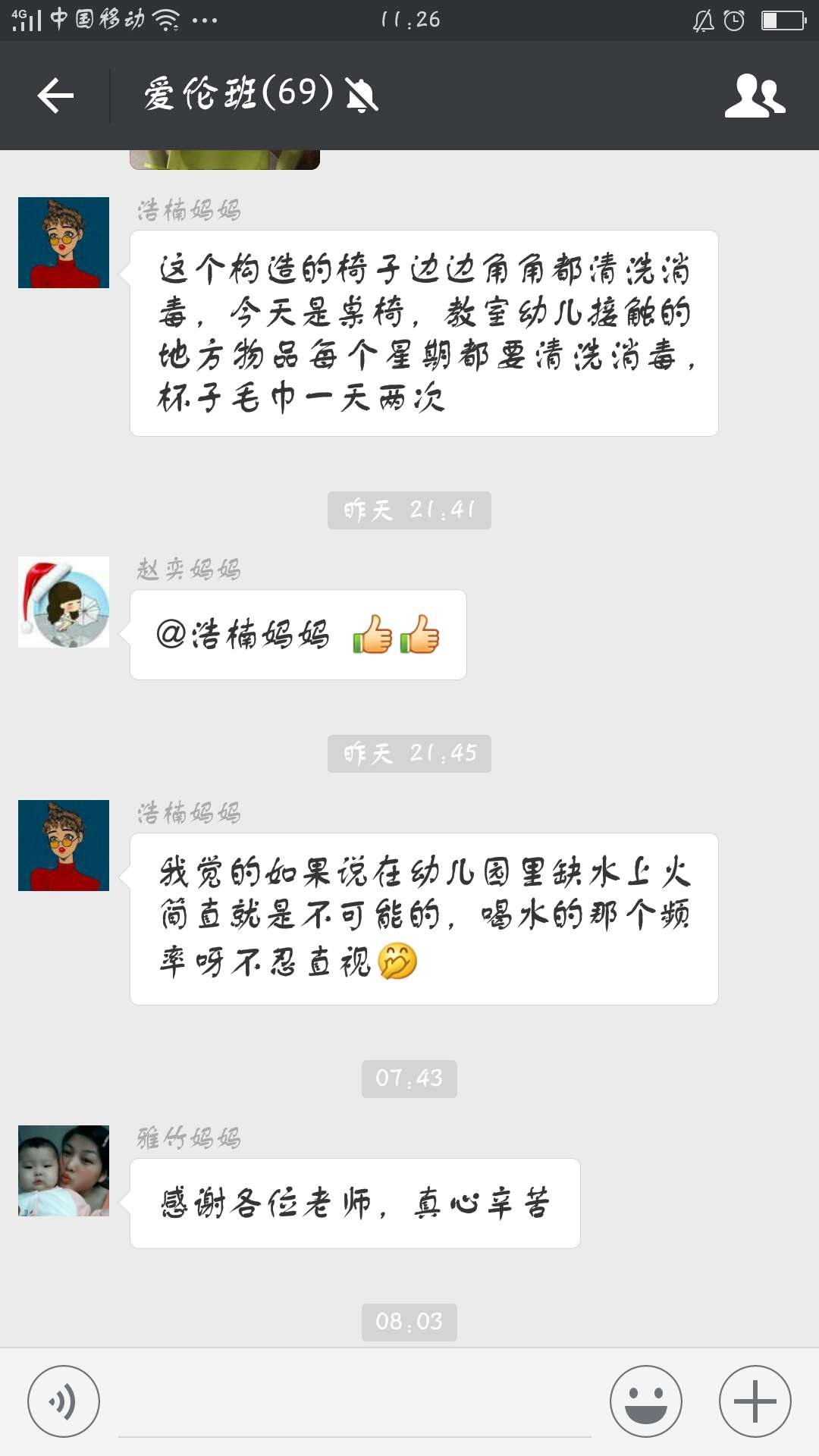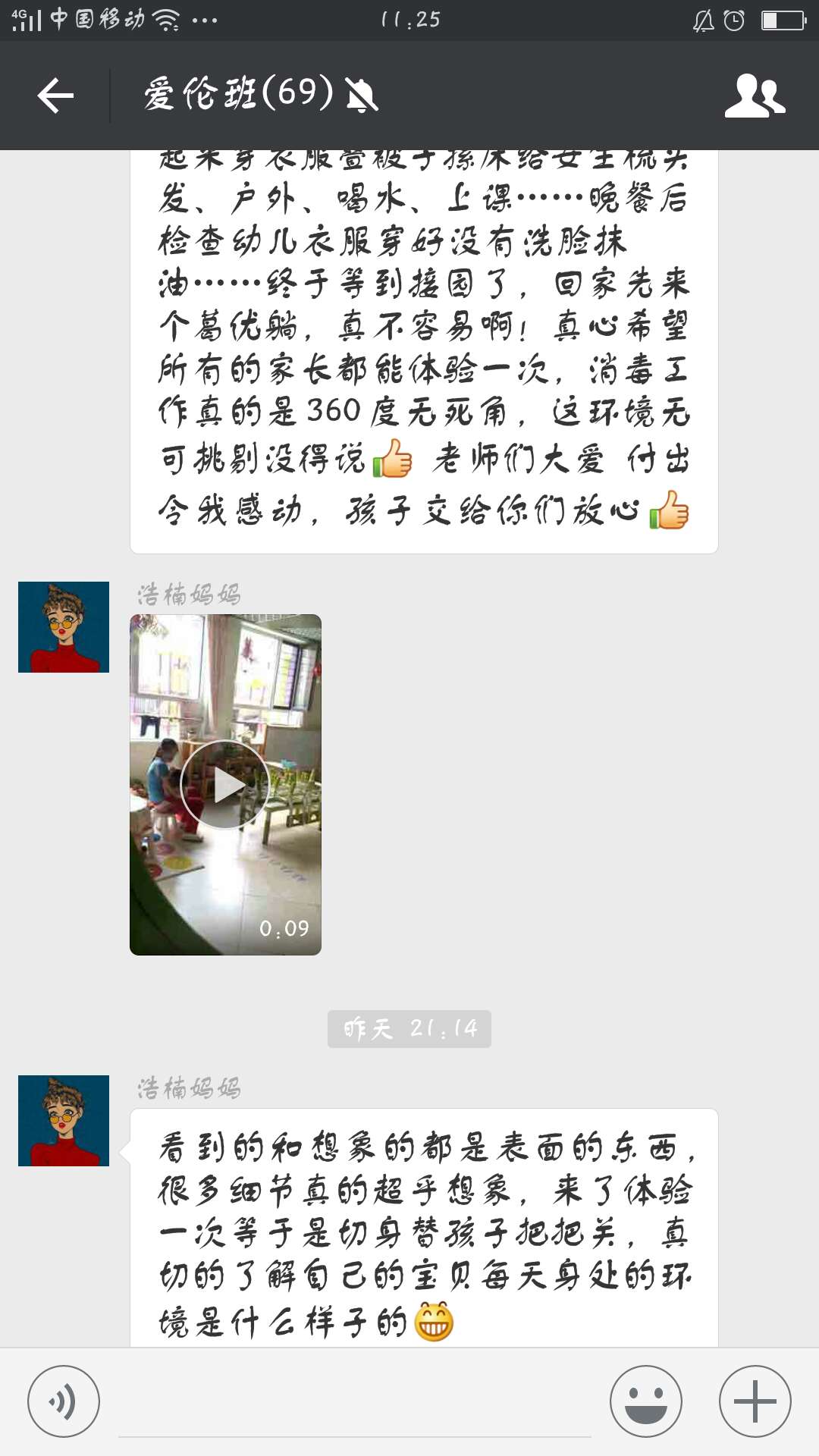 一日义工体验感触颇多,第一感觉就是孩子送来这里真放心,通俗点说就是真值,虽然是辅助老师干工作,但是工作量之大远超想象,从早上帮幼儿脱外衣穿围围分发饭菜,不会吃的得喂,喝水大小便提裤子还有加餐,直到上课孩子们才基本安顿下来,空余的这段时间就是清洗消毒桌椅,边边角角椅子底下都得清洗到,没等我们两个人干完又到了户外时间,暂停手里的活儿再帮孩子们穿衣服看护排队到户外活动,中间不间断会有小朋友要回教室小便,老师们就得一趟一趟的不厌其烦领着上厕所,户外结束回教室喝水,还是重复着帮孩子们大小便提裤子看护孩子们,时刻操心怕孩子们磕着碰着,午饭后的午休时间老师们依然不可能闲下来,小班的孩子们不睡觉的哭闹的,老师们顾不上吃饭,抱着安抚,还得清洗消毒一大盆小毛巾,这个时候的我是既劳累又感动,深深体会到老师们对孩子们的爱和不易,然后又得准备下午加餐水果,孩子们睡起来穿衣服叠被子摞床给女生梳头发、户外、喝水、上课……晚餐后检查幼儿衣服穿好没有洗脸抹油……终于等到接园了,回家先来个葛优躺,真不容易啊!真心希望所有的家长都能体验一次,消毒工作真的是360度无死角,这环境无可挑剔没得说!老师们大爱、付出令我感动,孩子交给你们放心。
