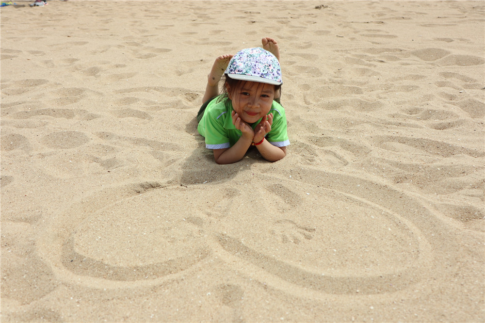 放风筝是我国民间传统文化。民国年间,“风筝魏”是天津风筝制作最为杰出的代表,至今天津人仍然喜欢以放风筝的方式休闲、娱乐。今天,玩够沙子的宝贝们和爸爸妈妈一起在阳光下,以细软的沙滩为创作基地,以无色的风筝为画板,或坐或趴,兴致勃勃地一起忙碌起来。他们挥洒着五彩斑斓的水粉,用笔表达着自己的美好愿望。