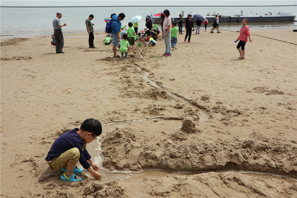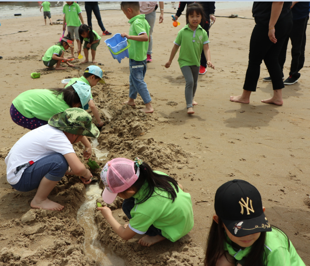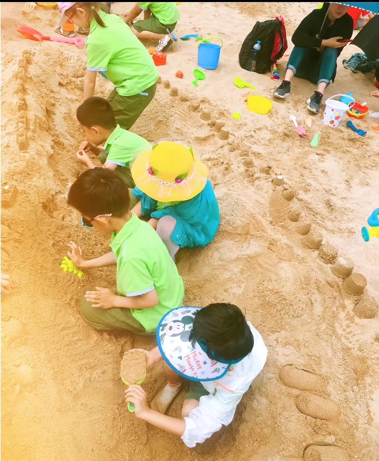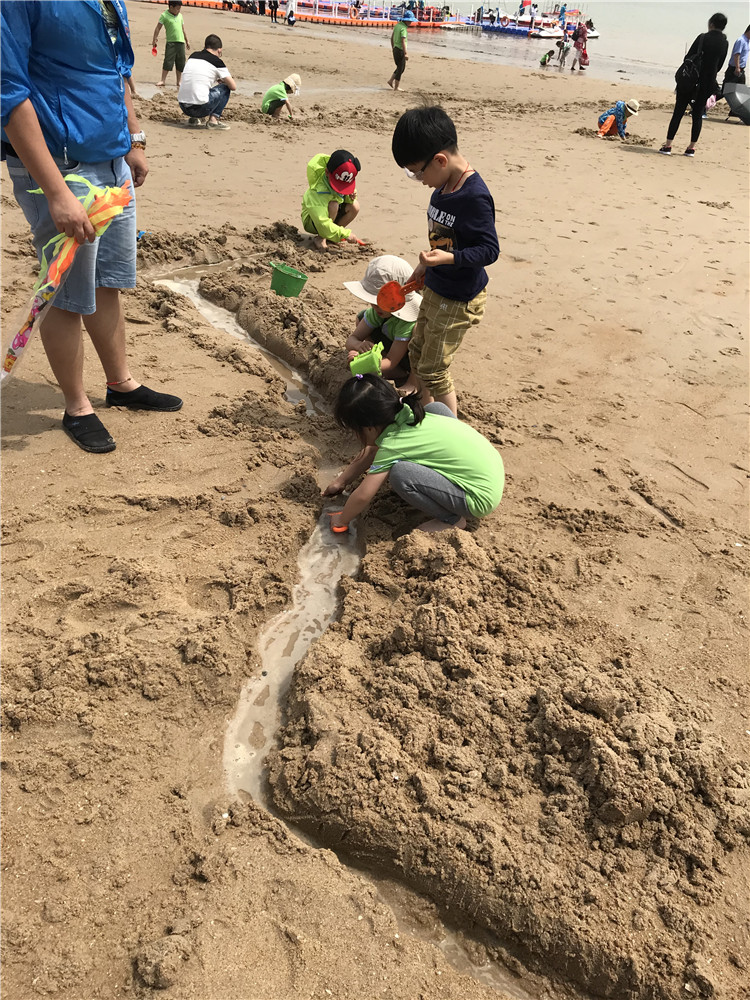 今天的东疆港沙滩上,到处是天津泰达布朗幼儿园的小朋友们可爱的身影,他们用工具、用双手神情专注的忙碌着。罗伊班小朋友一起合作共筑“长城”,罗格班小朋友齐心协力开出了蜿蜒的 “小河”,还有中班小朋友建造的“城堡”、深坑……宝贝们在游戏中,体验着沙的特性,体验着大自然回馈给他们的快乐,在合作中培养着互相协作的集体意识,释放着成功后的自信。